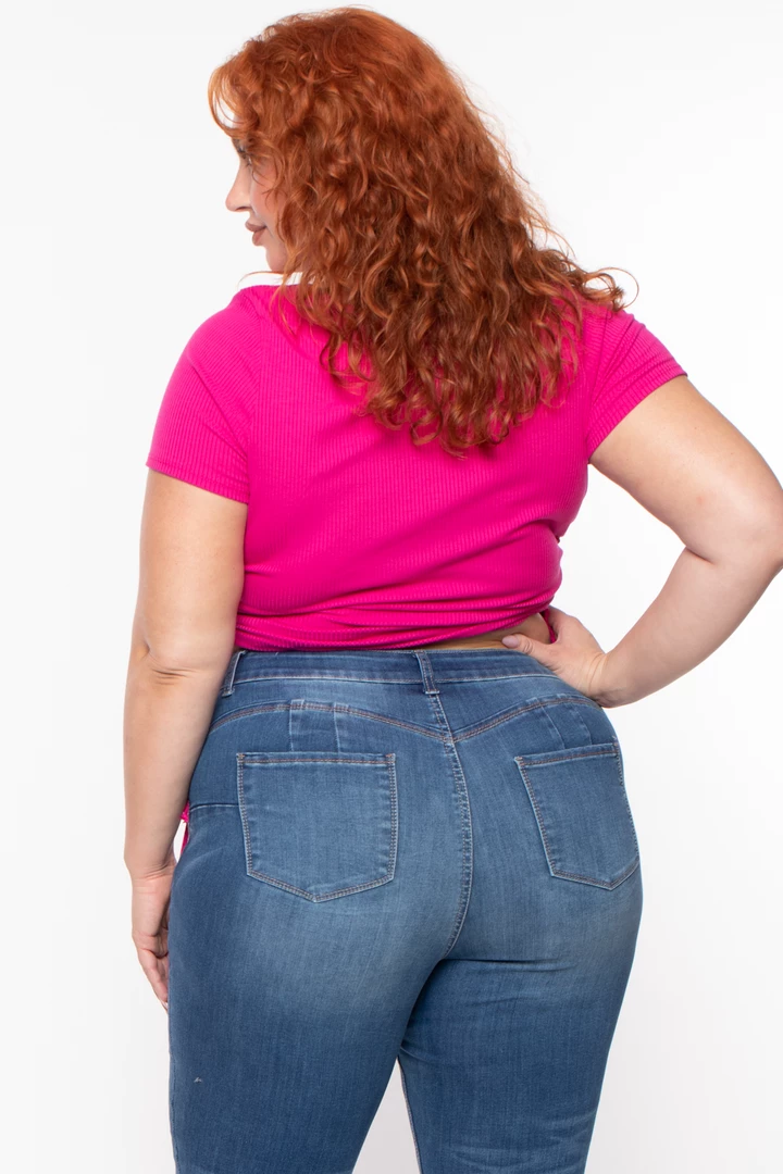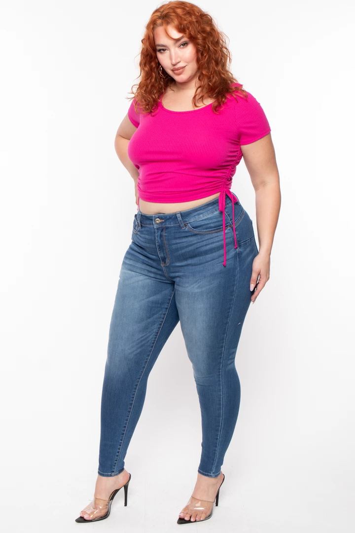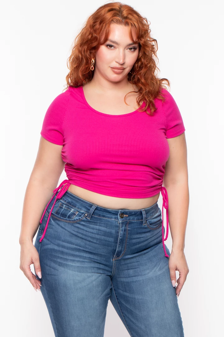 This plus size stretch top features a crew neckline, short sleeves, side ruched hem drawstrings that can be adjusted, and a cropped fit. Complete the look with high waist leggings or jeans.