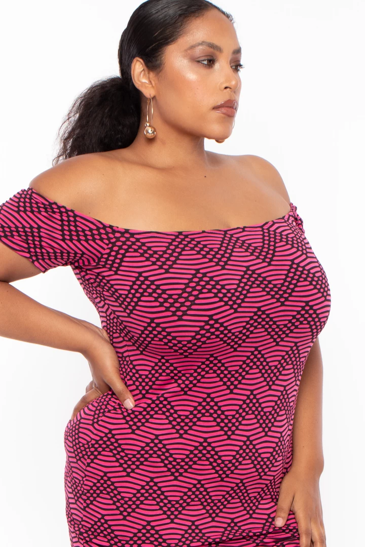 This plus size, stretch knit bodycon dress features an off-the-shoulder neckline, short sleeves a zig-zag pattern, and a side slit for a more fitted style.
