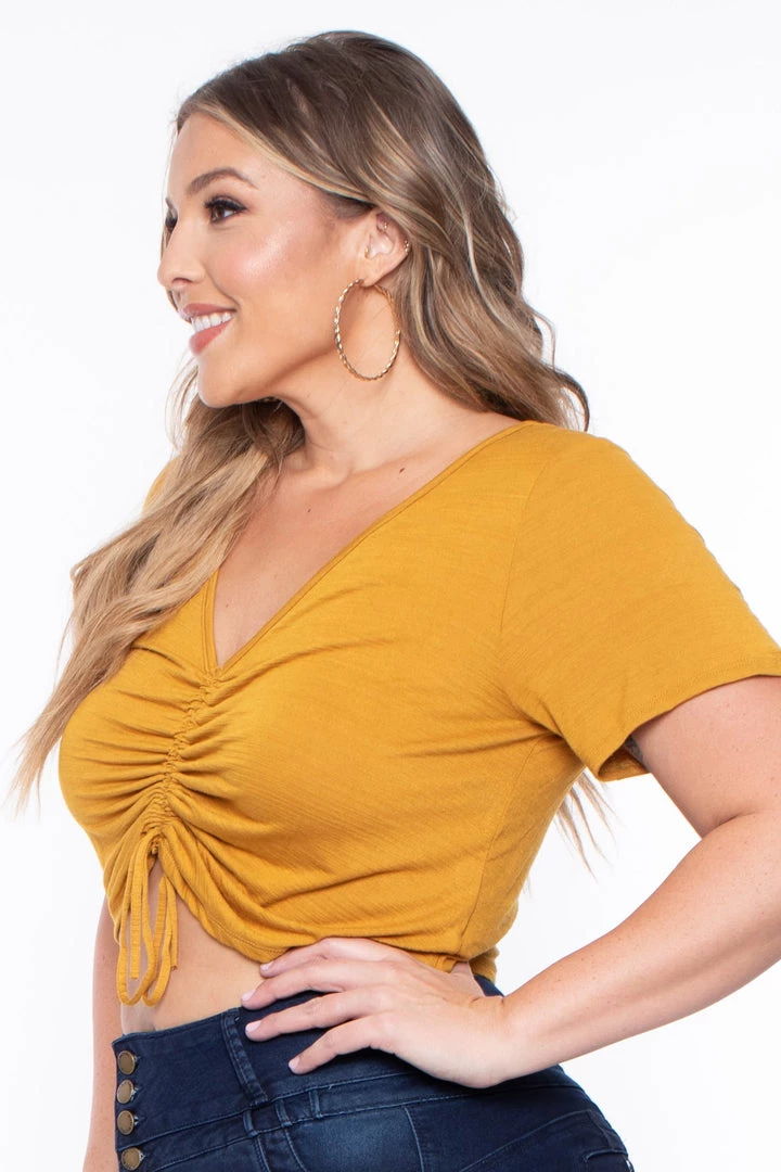 This plus size, stretch top features a crop top with V-neckline short sleeves, and front ruched detail that can be adjusted, this texturedd fabric is very comfy