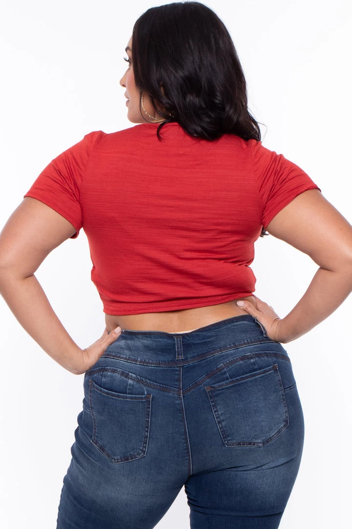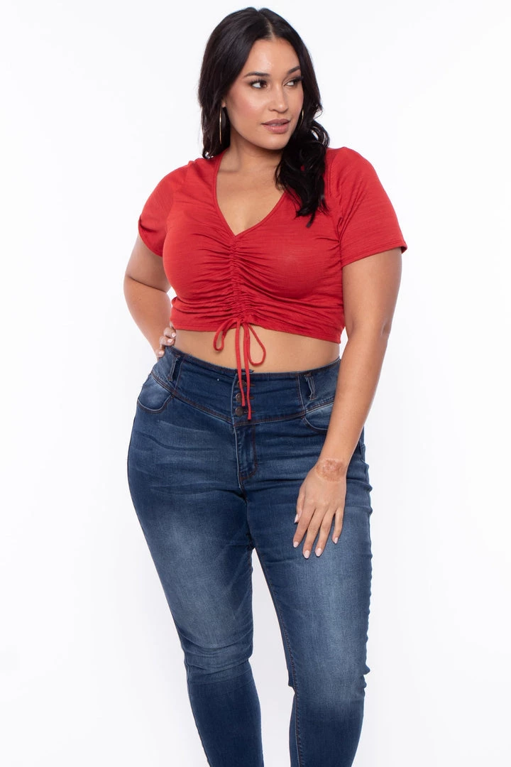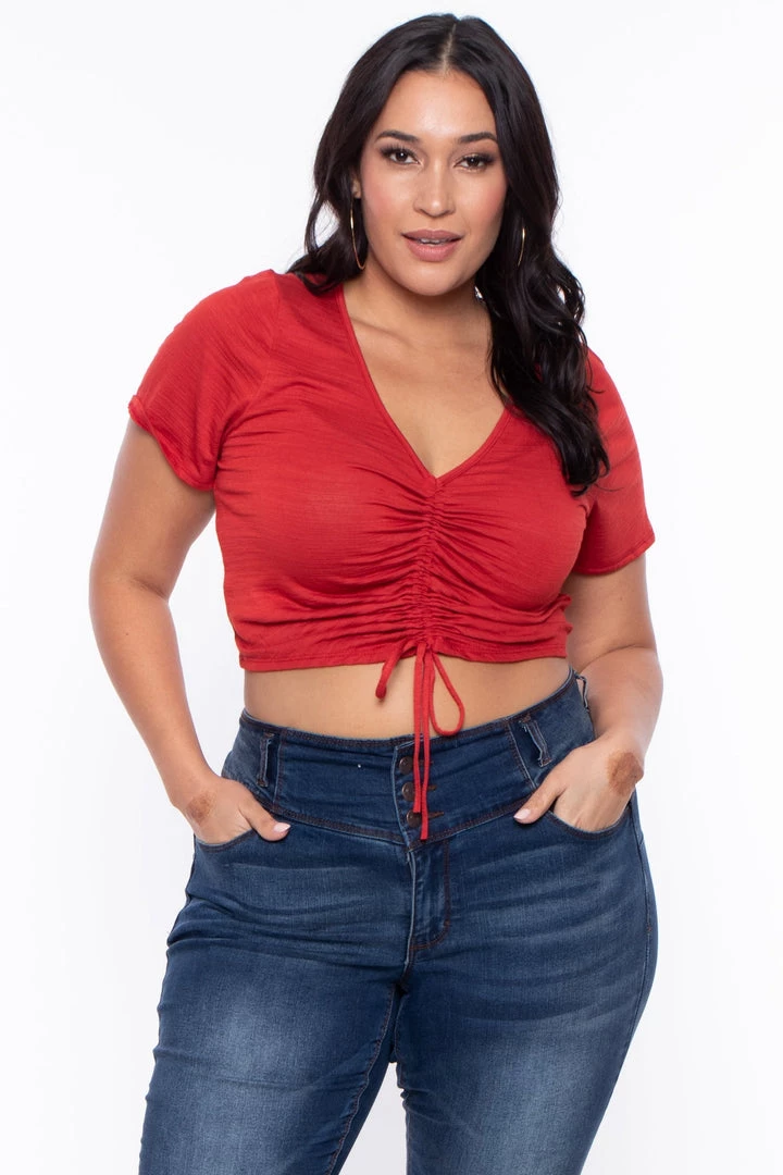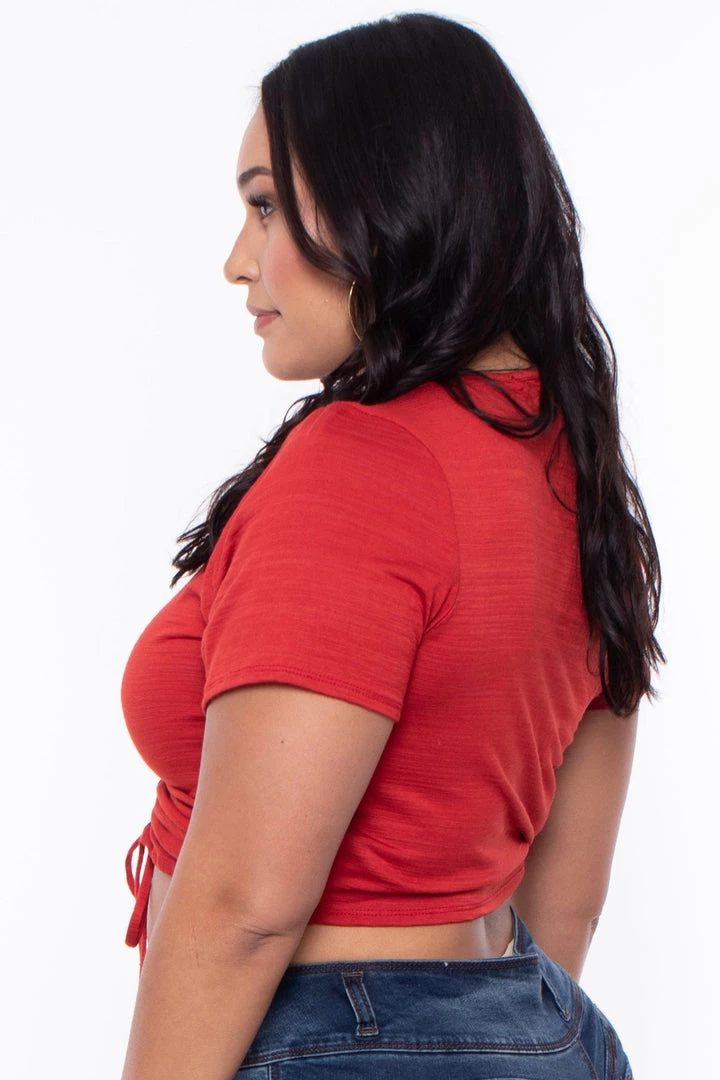 This plus size, stretch top features a crop top with V-neckline short sleeves, and front ruched detail that can be adjusted, this texturedd fabric is very comfy