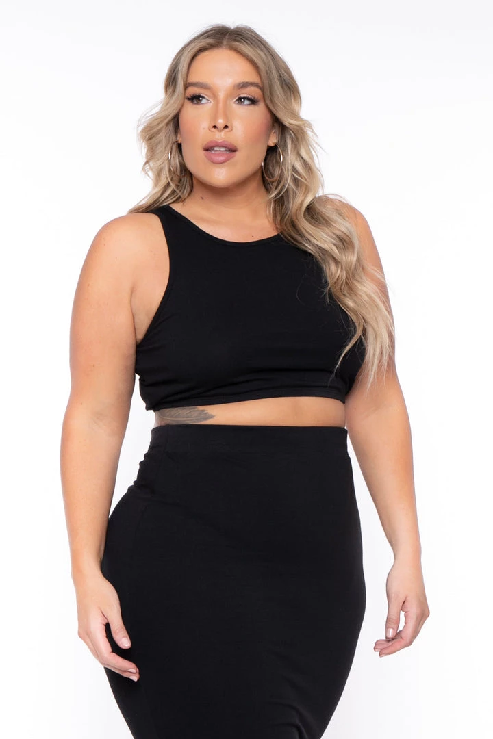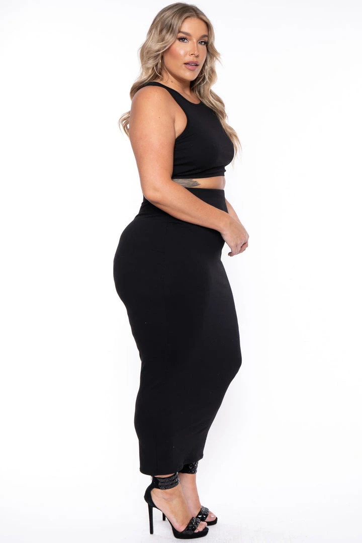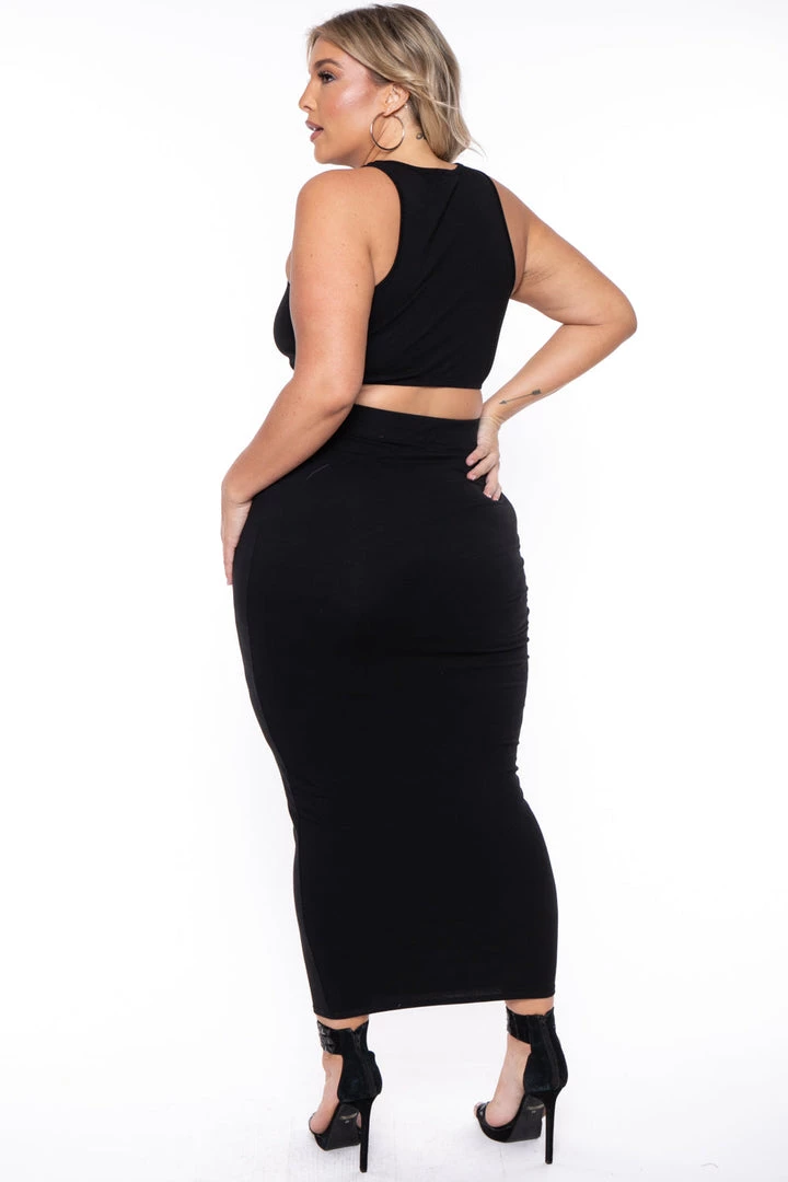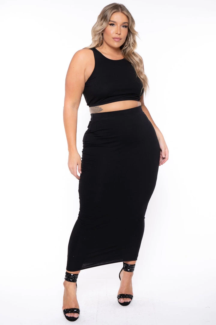 This plus size, tank and skirt matching set features a curve hugging silhouette, sleeveless cropped tank and midi length skirt