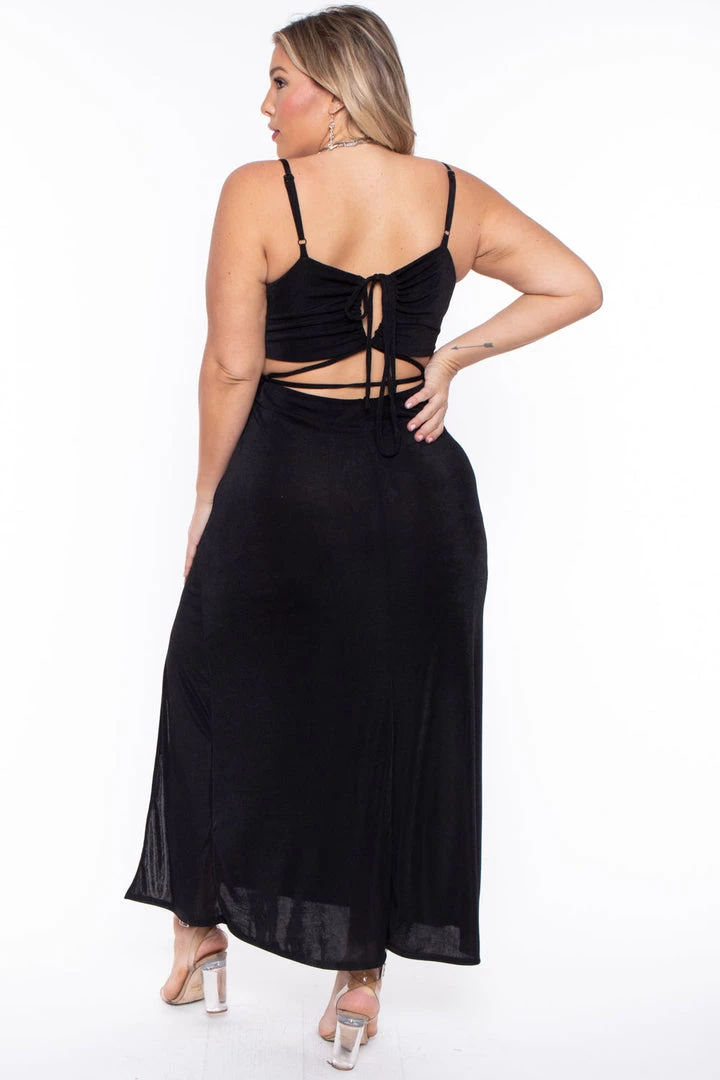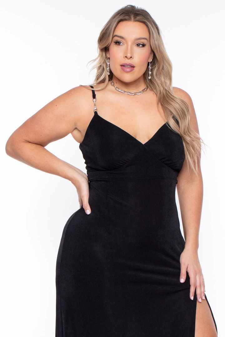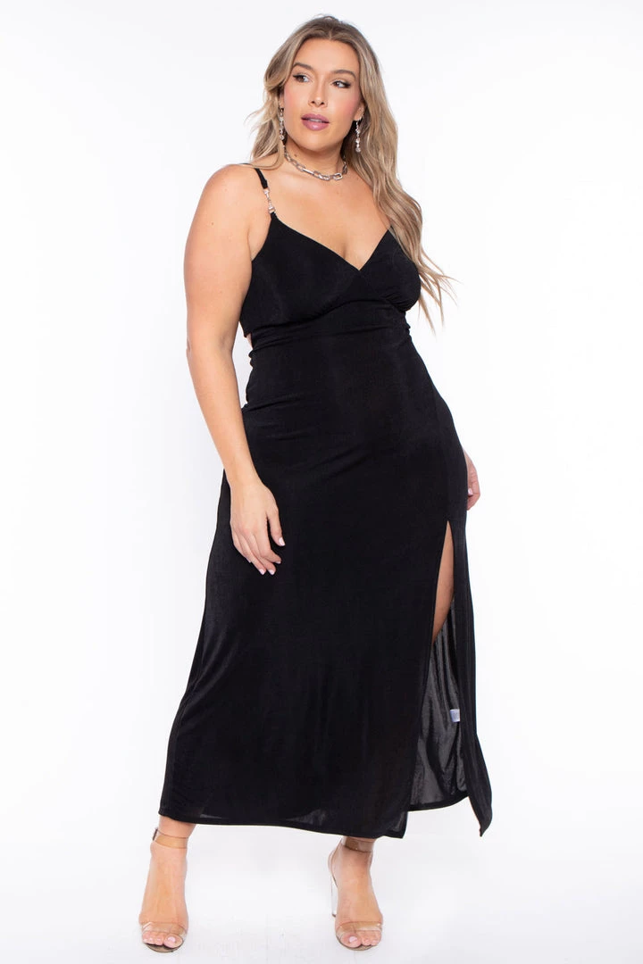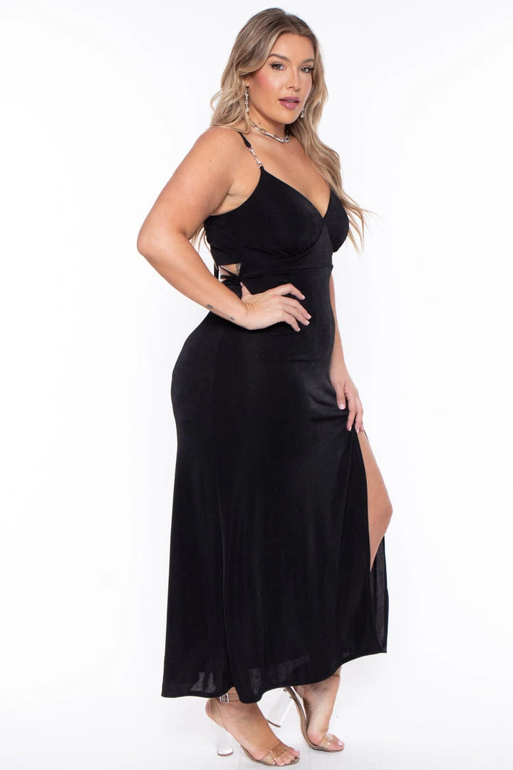 This plus size, slinky dress is elegant and perfect for a red carpet event. Celine features adjustable straps with bling details, v neckline, tie back with sexy cut outs and front slit detail