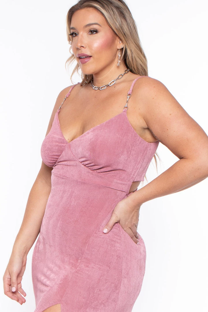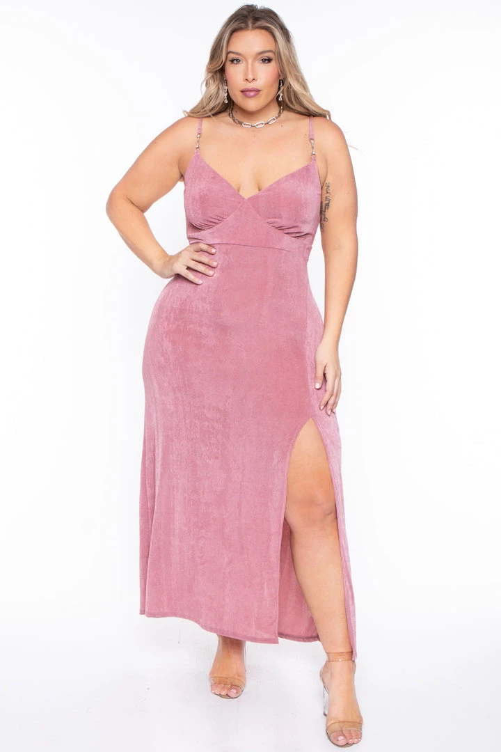 This plus size, slinky dress is elegant and perfect for a red carpet event. Celine features adjustable straps with bling details, v neckline, tie back with sexy cut outs and front slit detail