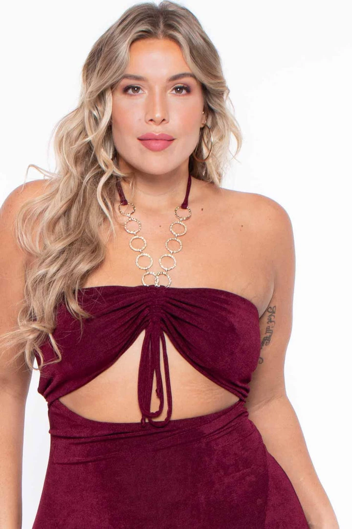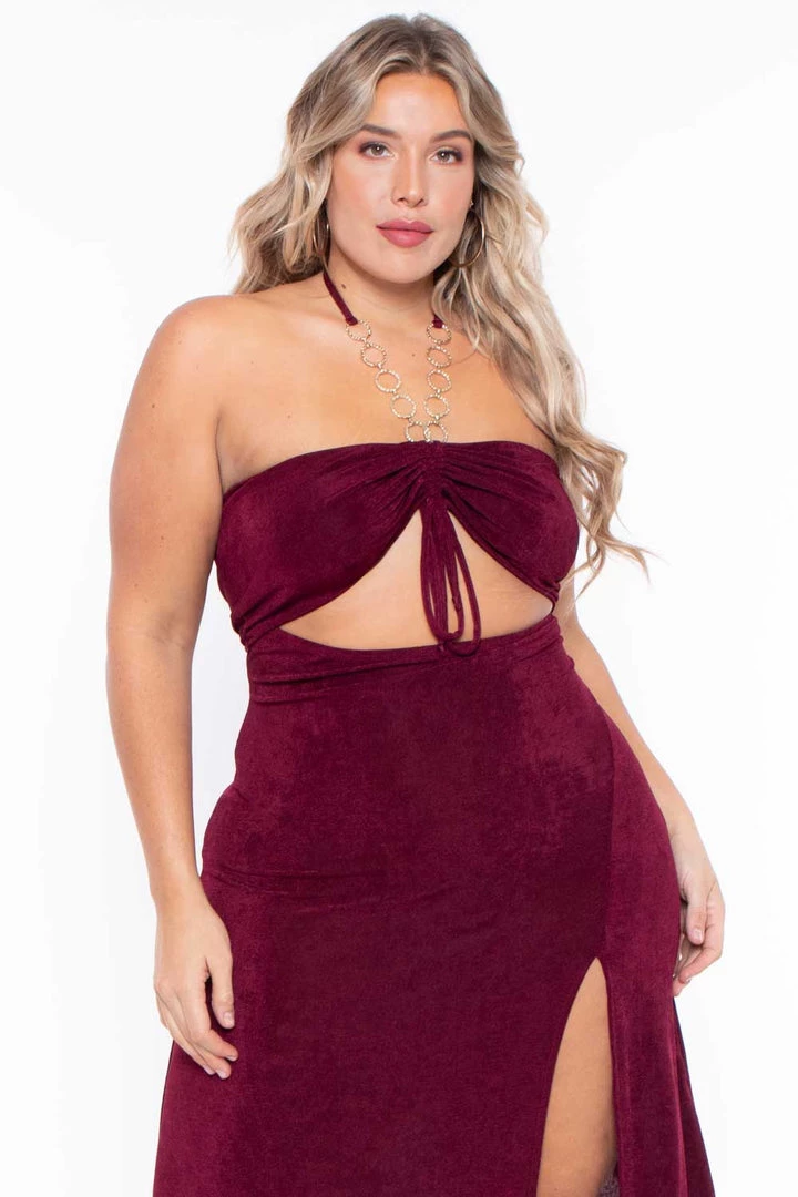 This plus size, dress is perfect for dancing the night away. It features a front lined bodice with adjustable ruched ties, center cut out, adorned with a beautiful textured ring necklace trim, spaghetti halter ties in back, midi length with a dramatic front slit.