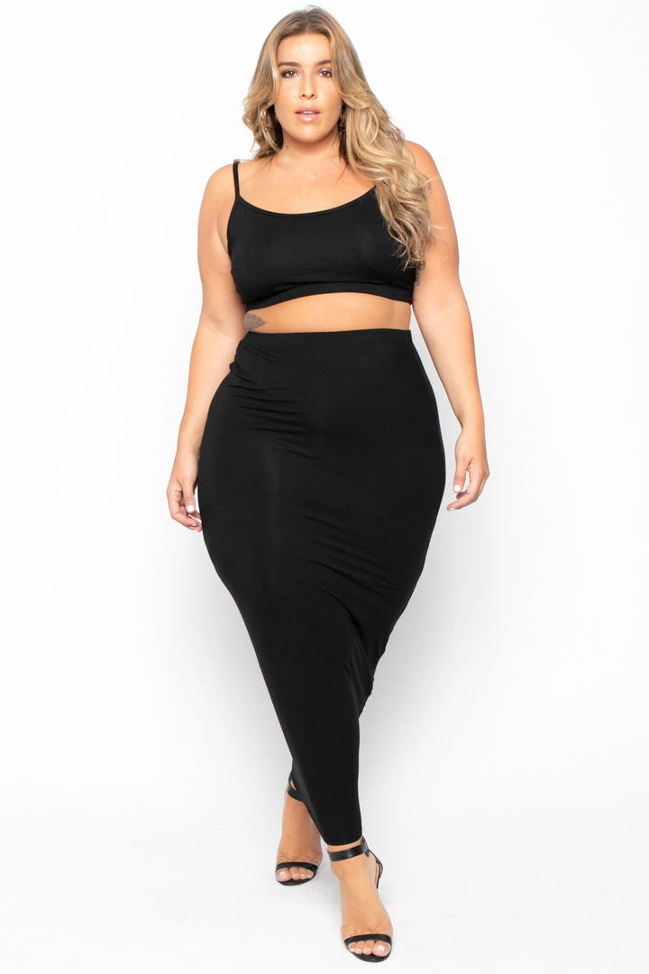 This plus size, stretch two-piece set features a crop top with a scoop neckline, cami straps, elastic ribbed crop hem, a matching skirt with an elastic waist, and form fitting silhouette