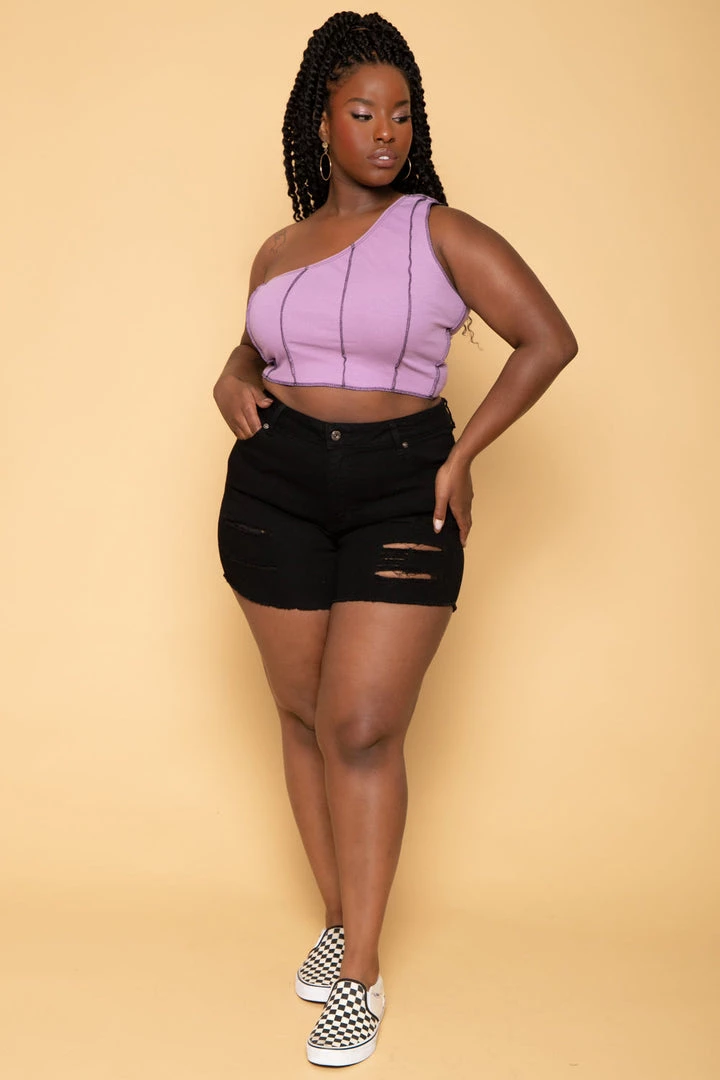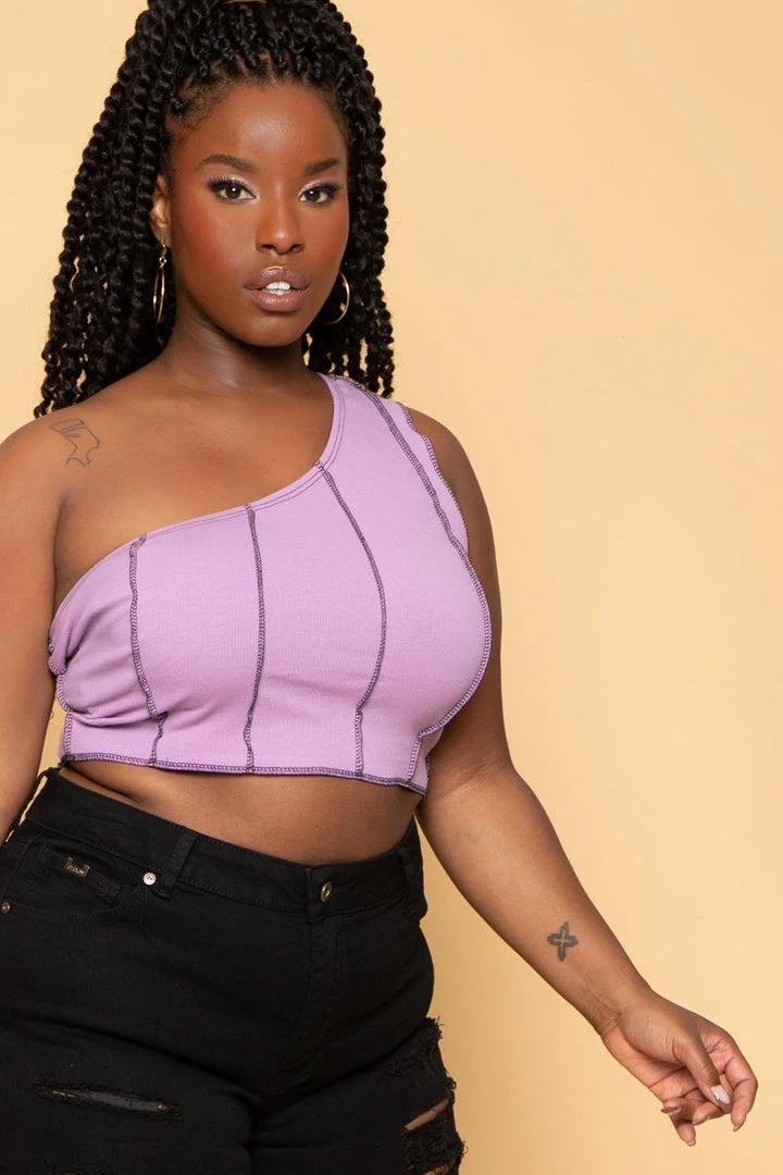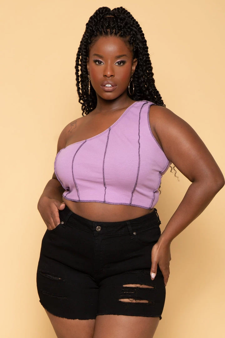 This plus size, one shoulder top features an asymmetrical neckline, soft ribbed fabric, with contrast stitching exposed seams and a cropped hem.