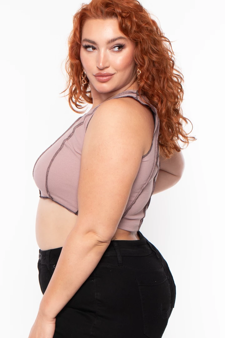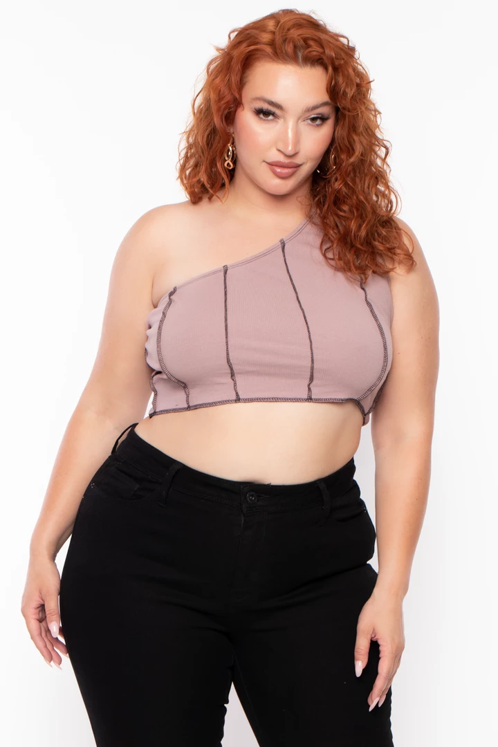 This plus size, one shoulder top features an asymmetrical neckline, soft ribbed fabric, with contrast stitching exposed seams and a cropped hem.Â