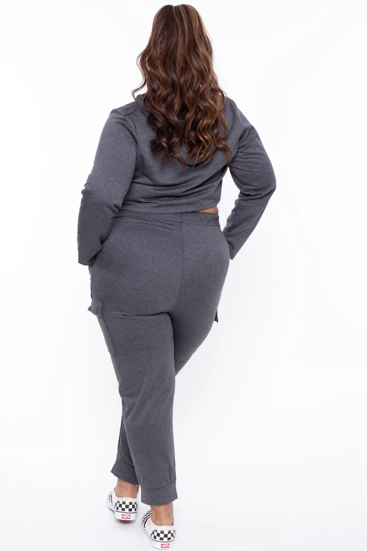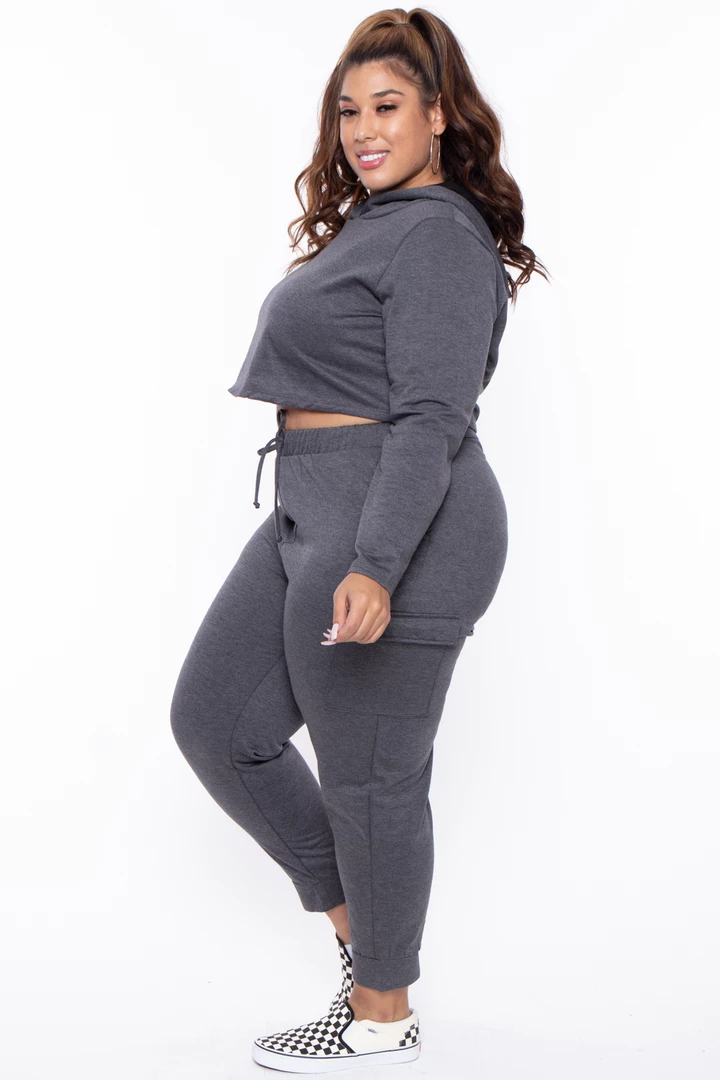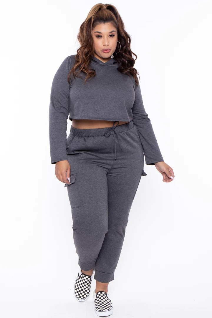 This plus size set futures a hoddie with a round neckline crop hem and self banded long sleeves. The pants have an elasticized waistband with drawstring side pockets and leg cargo pockets, self banded hemÂ