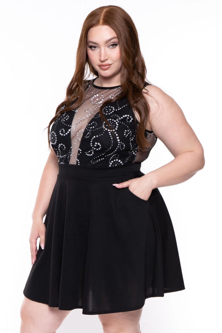 This plus size, lbd features an A-line flare silhouette, sleeveless, glitter bodice with mesh overlay and deep neckline, comes with pockets!