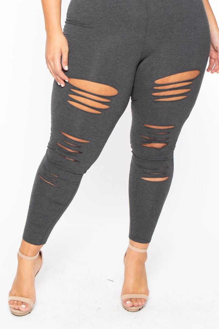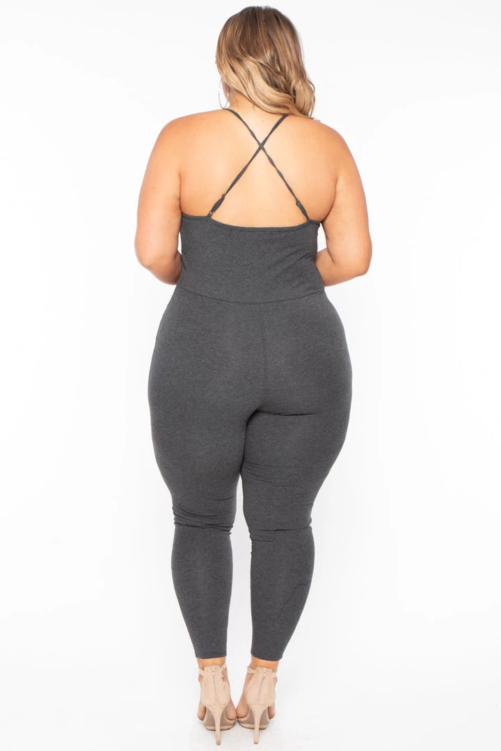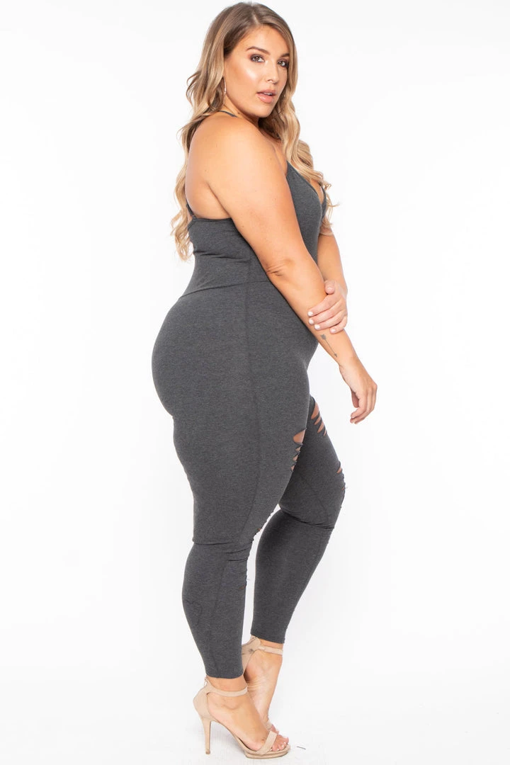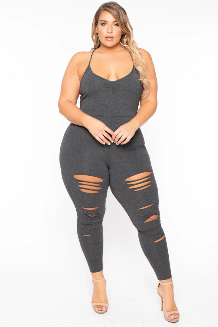 This plus size, stretch knit jumpsuit features a sleeveless design, a v-neckline with adjustable straps for and added comfort, an allover destroyed look, contrast binding, a smocked design detail at bust, a tapered skinny leg with an elasticized rib knit binding at bottom hem.Â