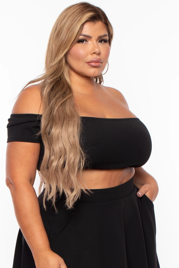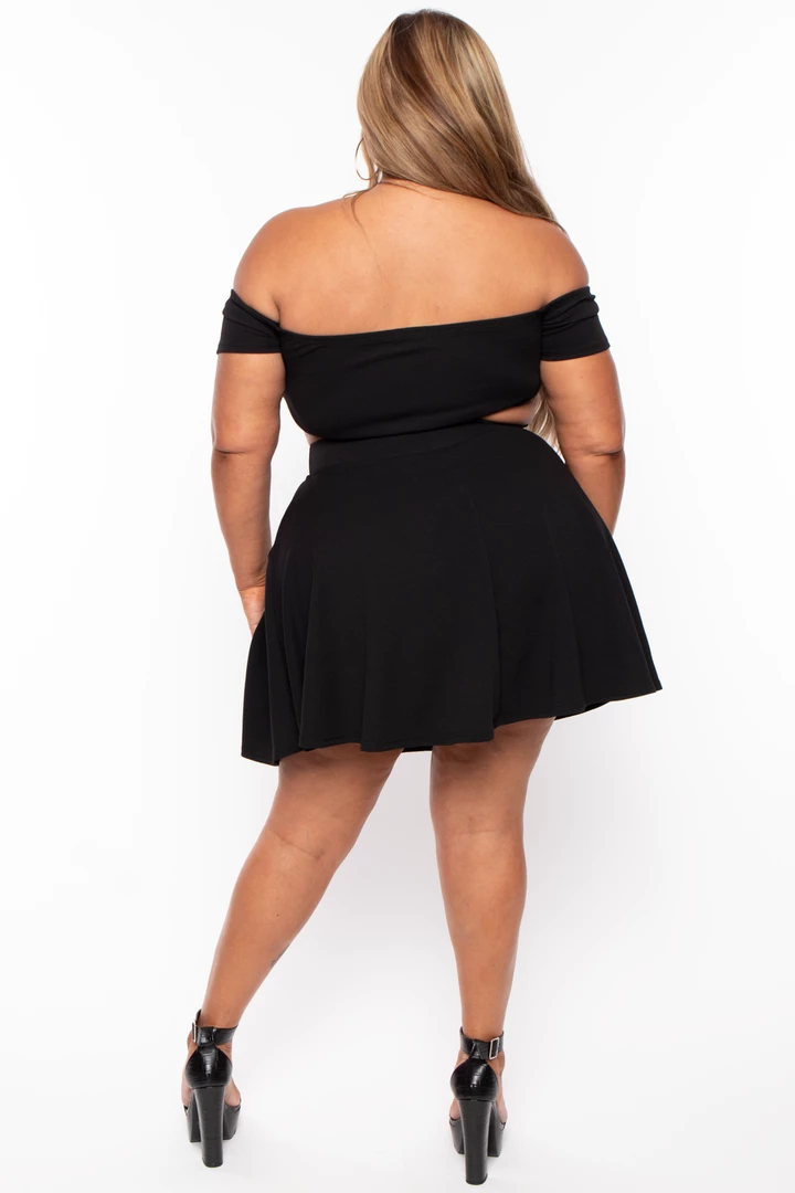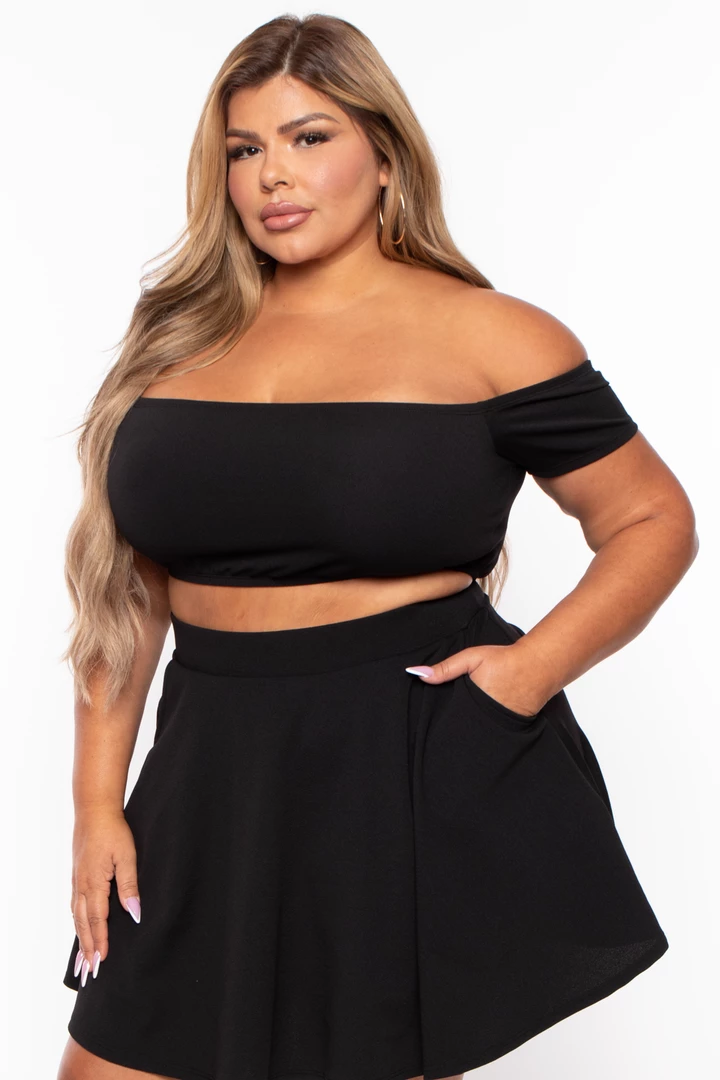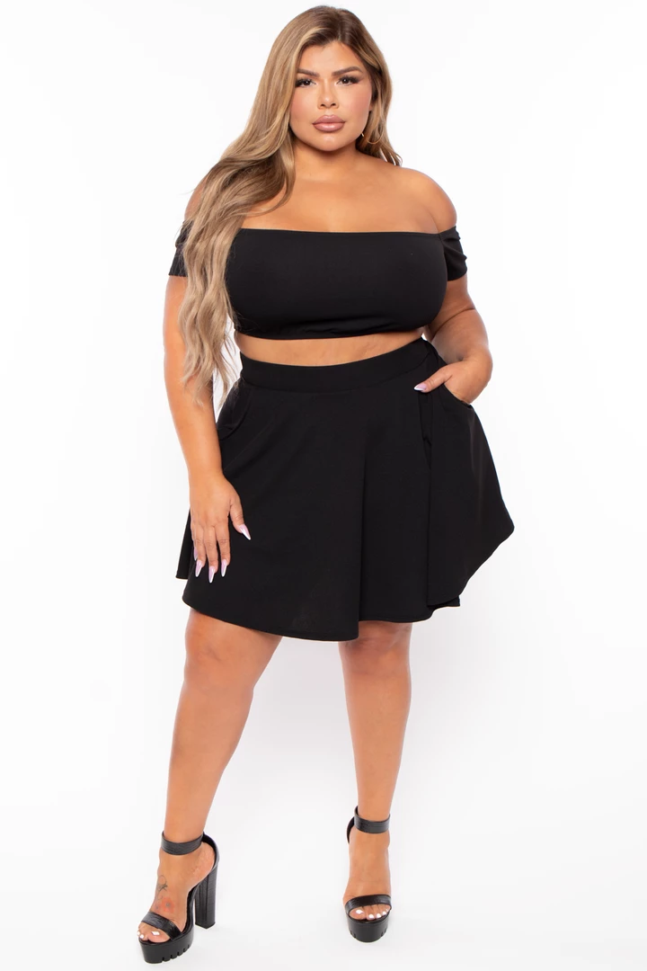 This plus size, stretch-woven top and skirt set feature an elasticized off-shoulder top with short sleeves, and elasticized waist hem, the skirt has an elastic waist, side pockets and mini flared length