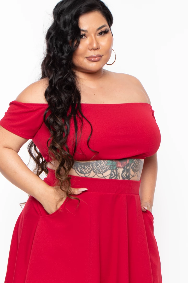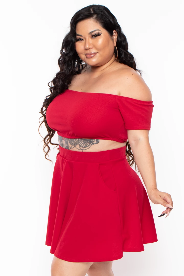 This plus size, stretch-woven top and skirt set feature an elasticized off-shoulder top with short sleeves, and elasticized waist hem, the skirt has an elastic waist, side pockets and mini flared length