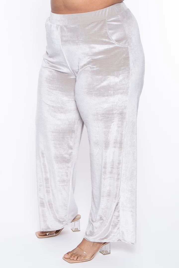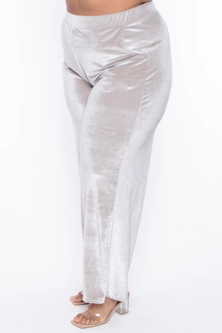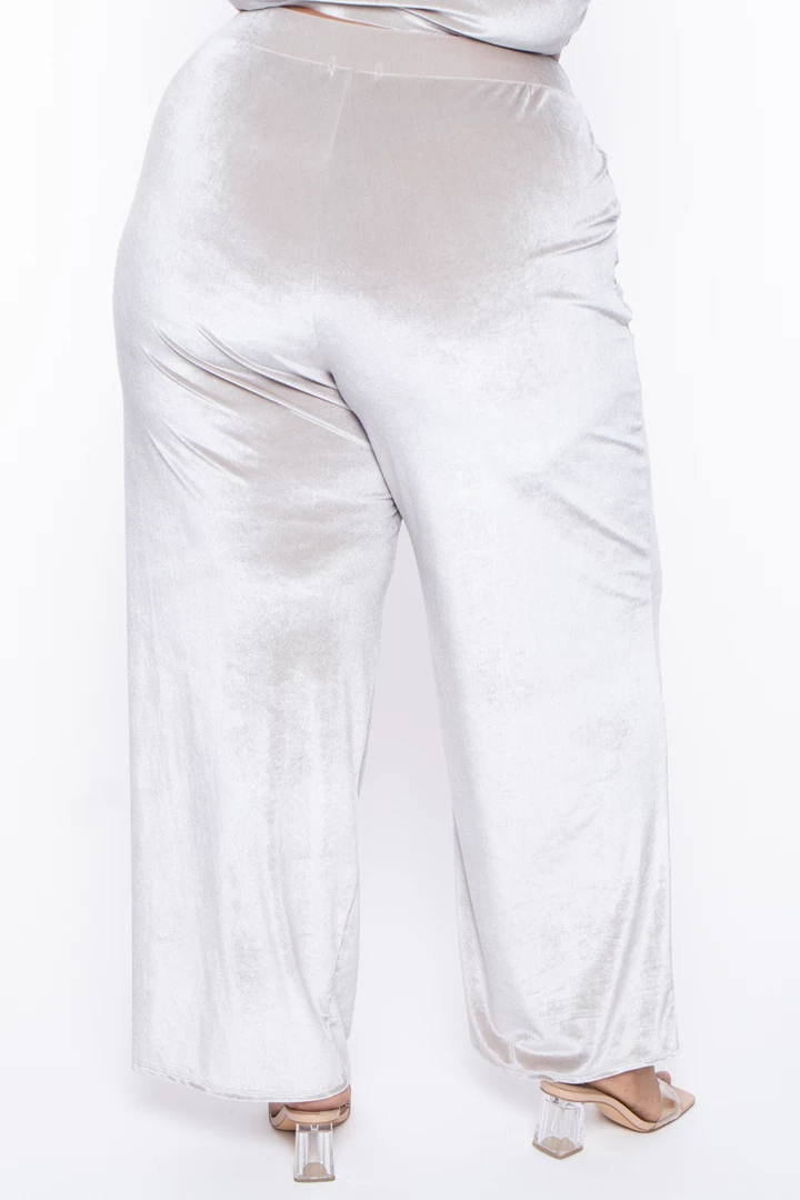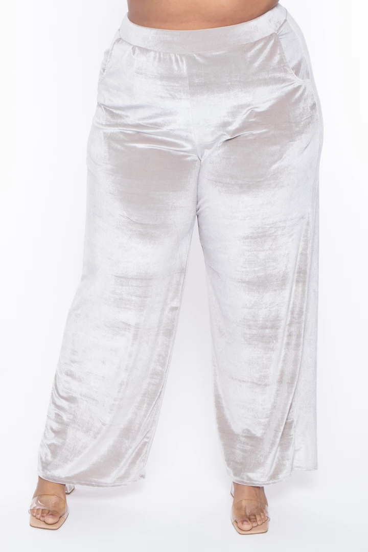 This plus size velour matching set features a bandeau top with elastic at neckline and at the hem, The pants have elastic waistband side pockets and flared leg, adorable and sexy set