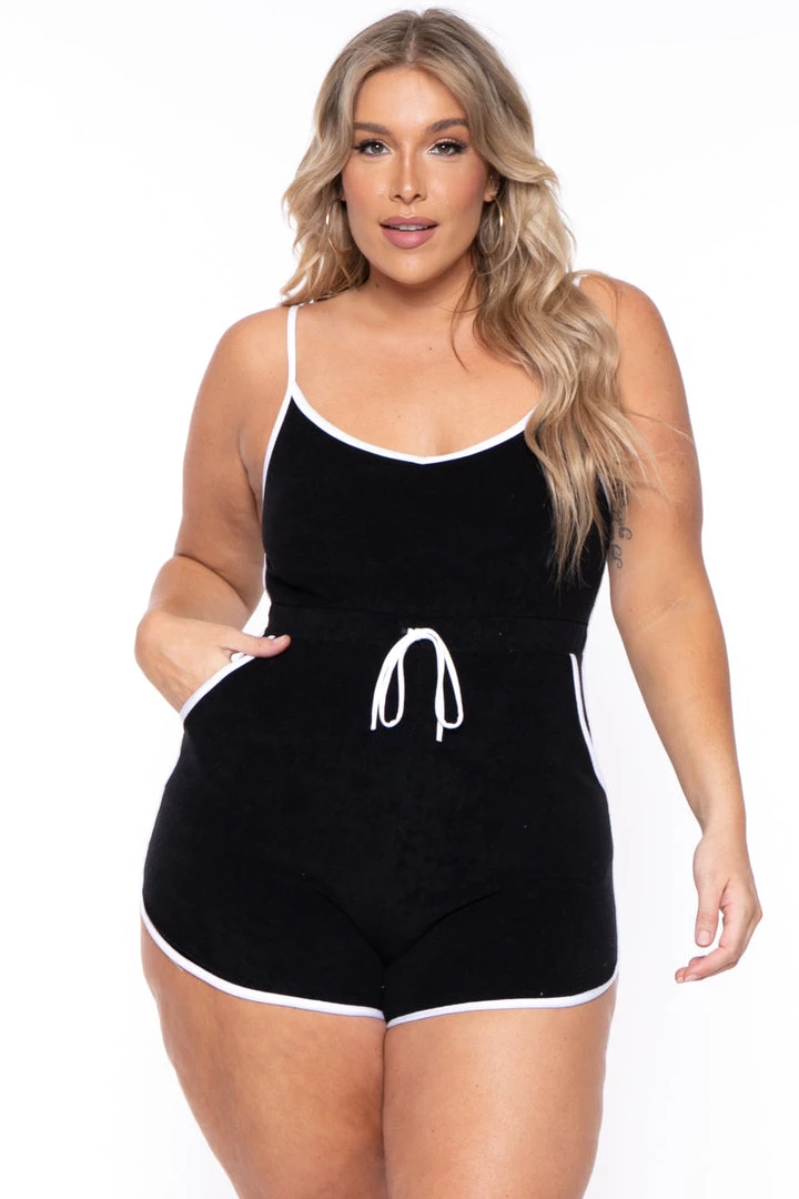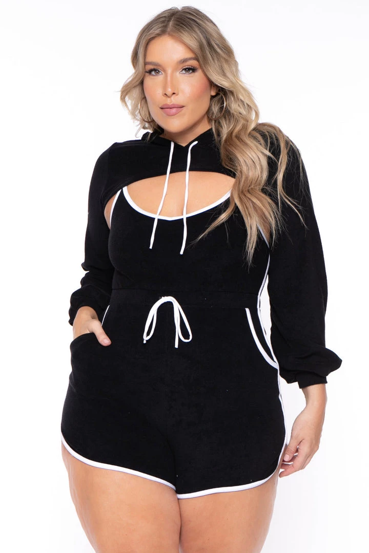 This plus size, 2 piece romper set features a topper with a hoodie and adjustable drawstrings. White accent trim and adjustable waistband.
