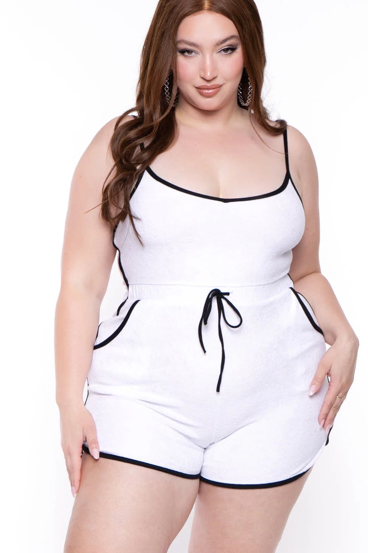 This plus size, 2 piece romper set features a topper with a hoodie and adjustable drawstrings. Black accent trim and adjustable waistband.