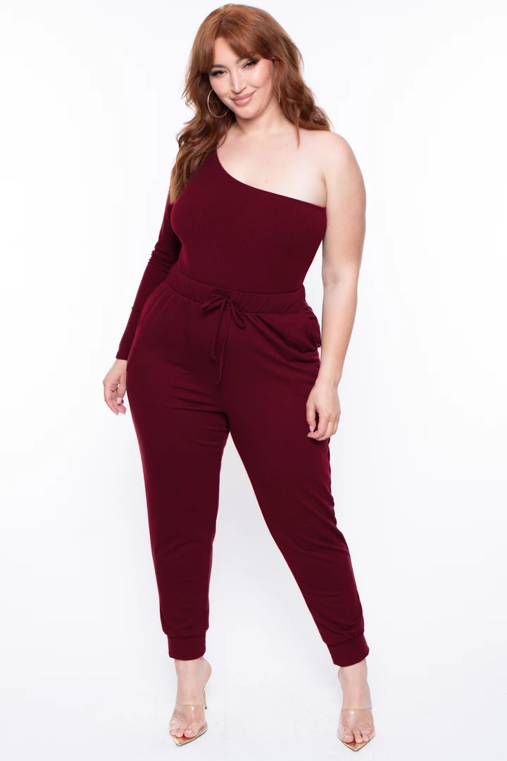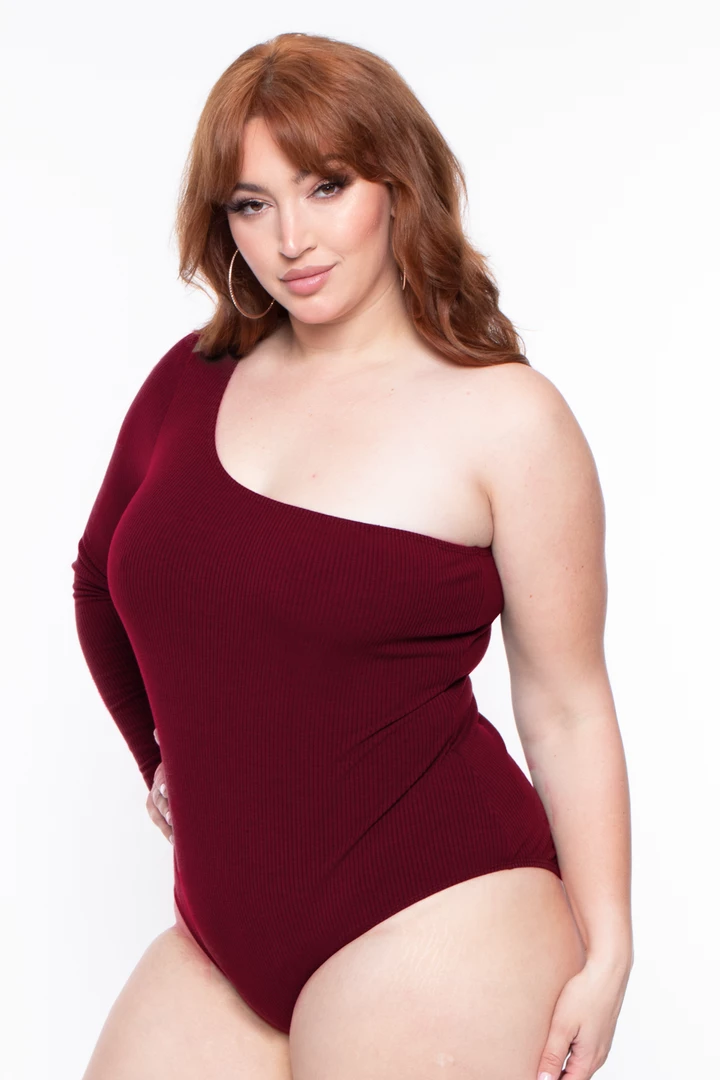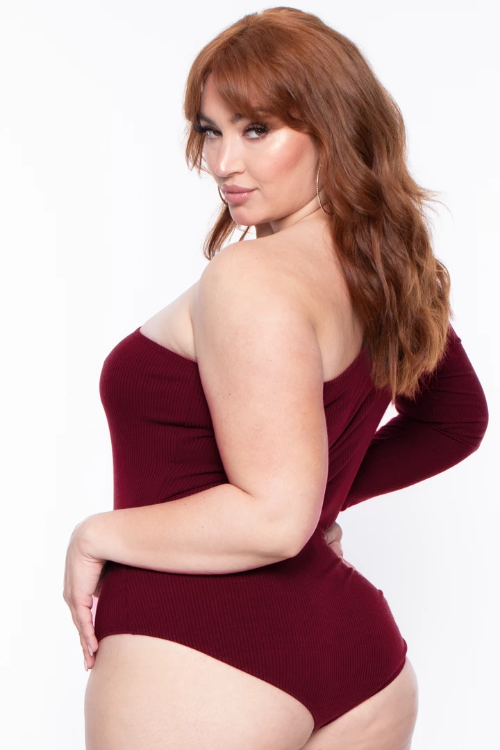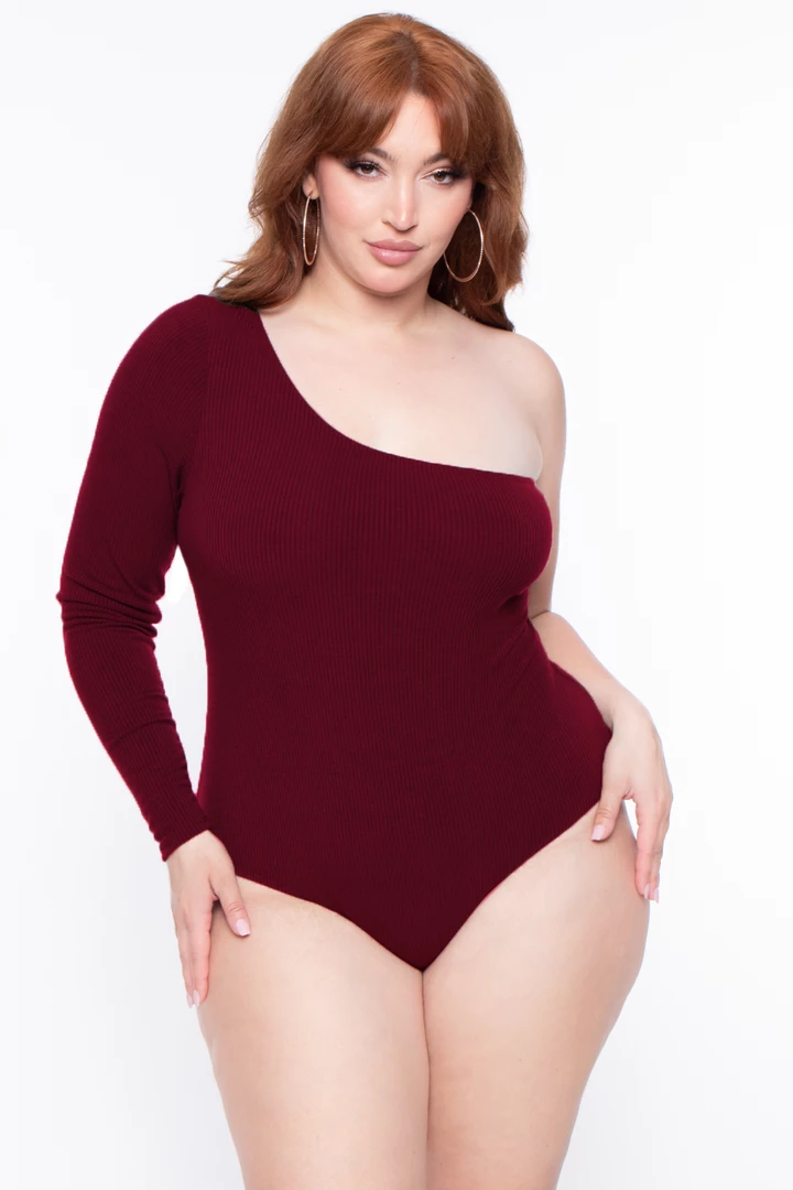 This plus size, stretch knit ribbed bodysuit futures: an asymmetric neckline one sleeve ribbed texture, and dual snap-button bottom closures very sexy and cute