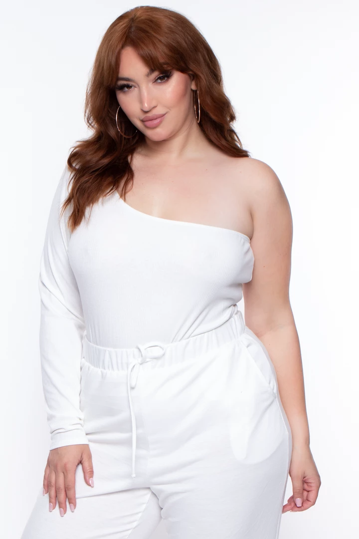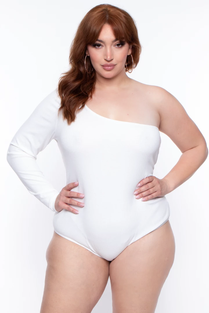 This plus size, stretch knit ribbed bodysuit futures: an asymmetric neckline one sleeve ribbed texture, and dual snap-button bottom closures very sexy and cute