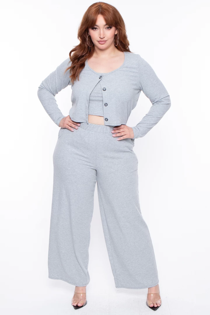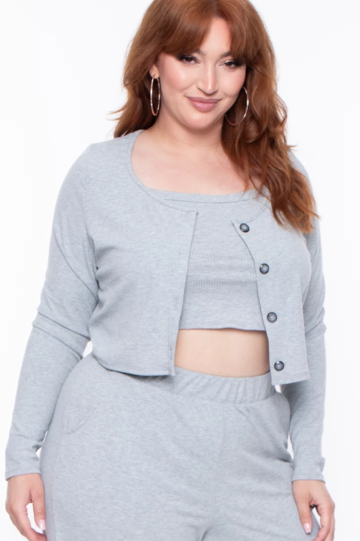 This plus size, stretch ribbed top features a scope neckline front button closure long sleeves, and a cropped hem a very comfy ribbed texture