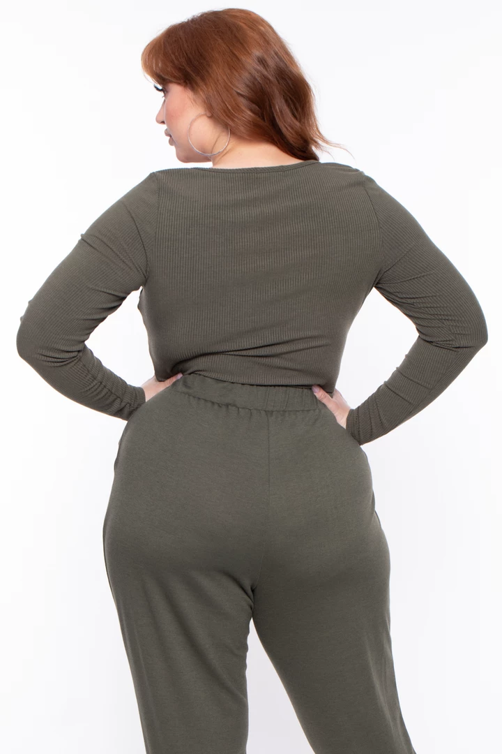This plus size, stretch ribbed top features a square neckline long sleeves, and a semi crop length, a very comfy ribbed texture