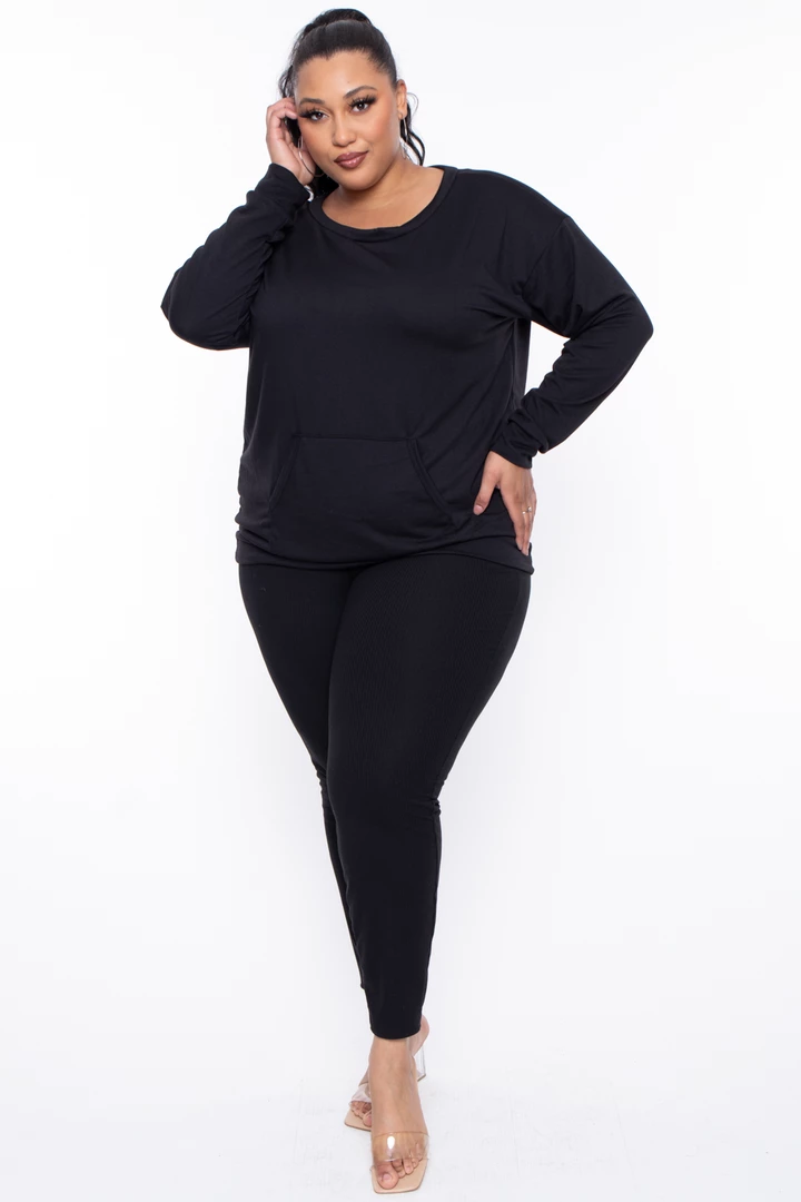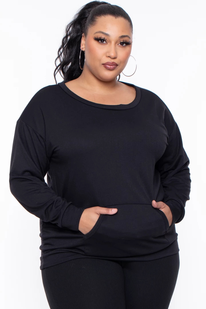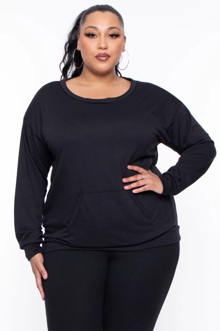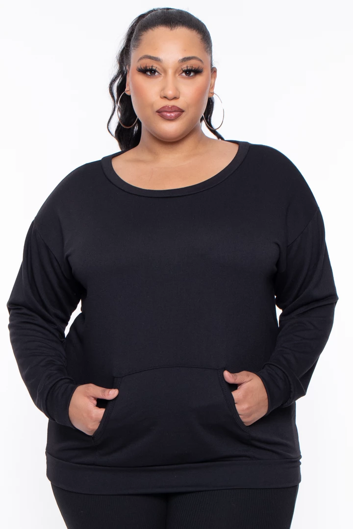 A plus-size, knit pullover featuring a round neckline long sleeves with self-cuffs, front kangaroo pocket, and a self banded hem