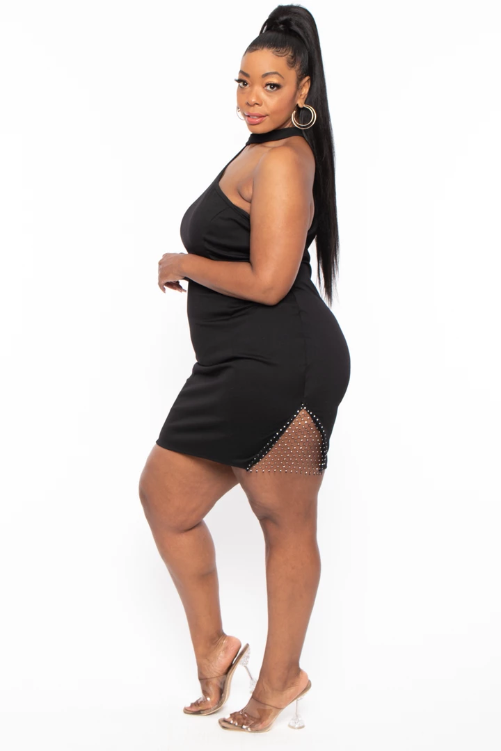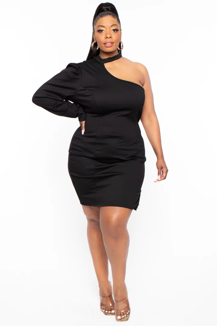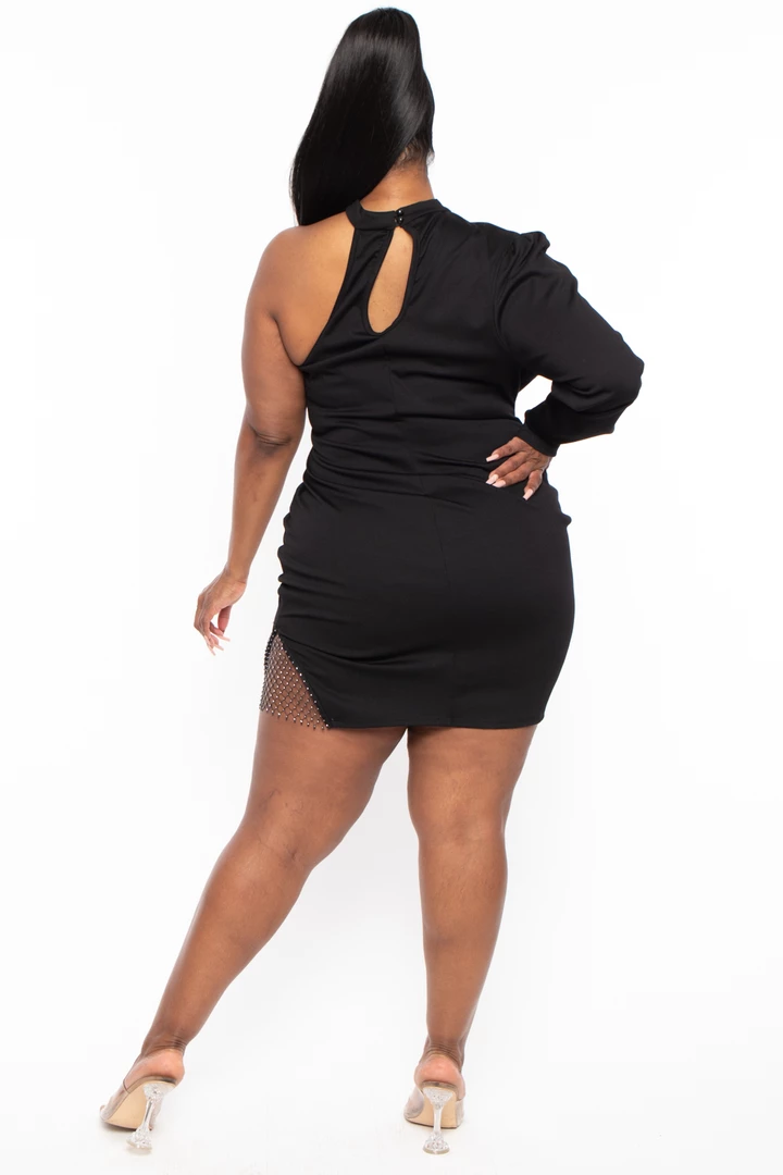 This plus size stretch mini dress features a crew neckline with an attached collar strap for an added style back keyhole and dual button closure one long sleeve side hem rhinestone detail and a bodycon silhouette,