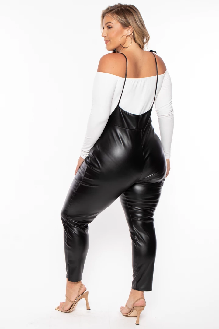This plus size stretch jumpsuit features a high-rise waist, tie-up spaghetti straps, and a skinny hugging silhouette with ankle slits. Pair this very sexy faux jumpsuit with our plus size essential ribbed off the shoulder bodysuit in ivory.