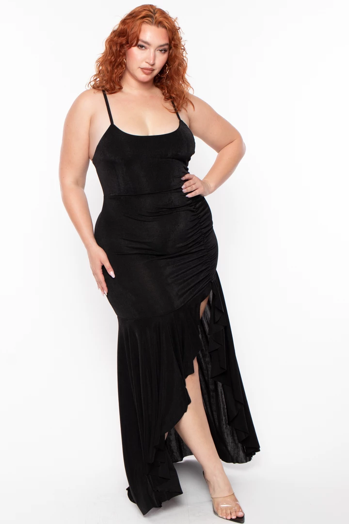 This plus size, stretch knit dress features a curve-hugging silhouette, spaghetti straps, ruching on the front side and back centre, and a cascading ruffle hem
