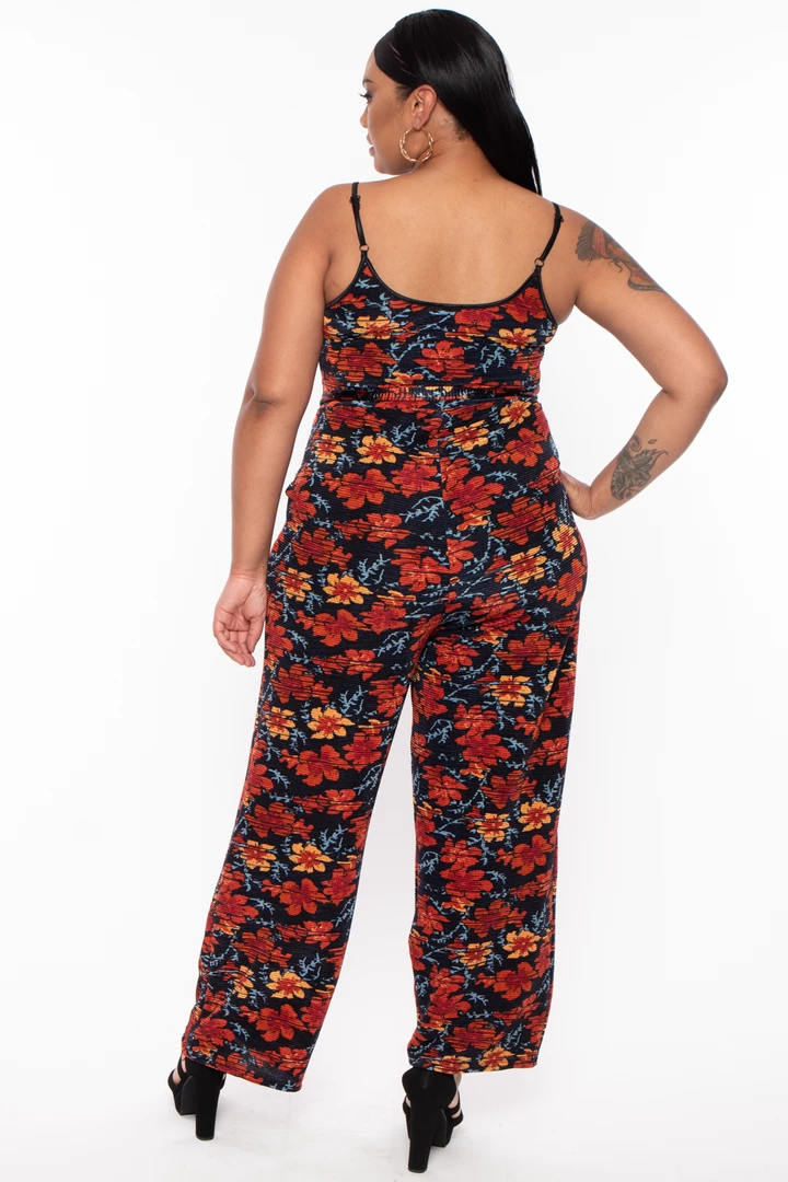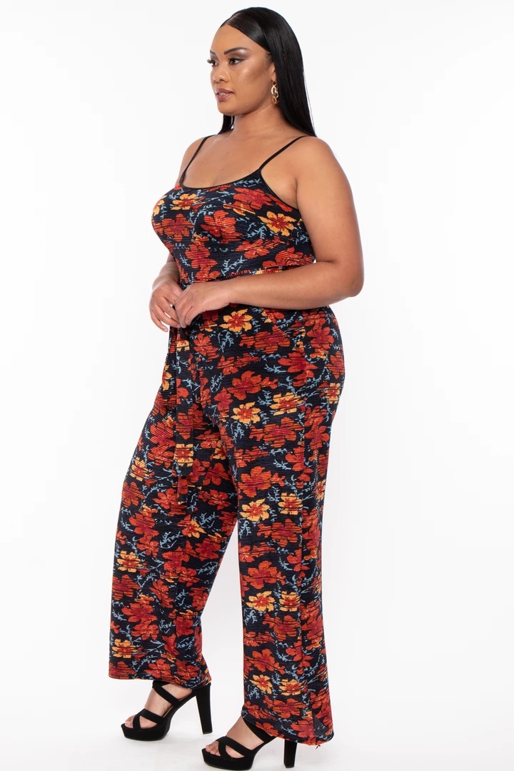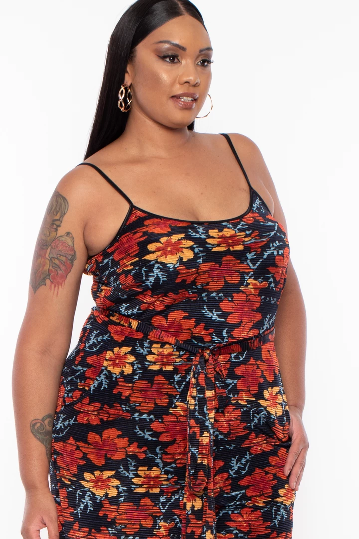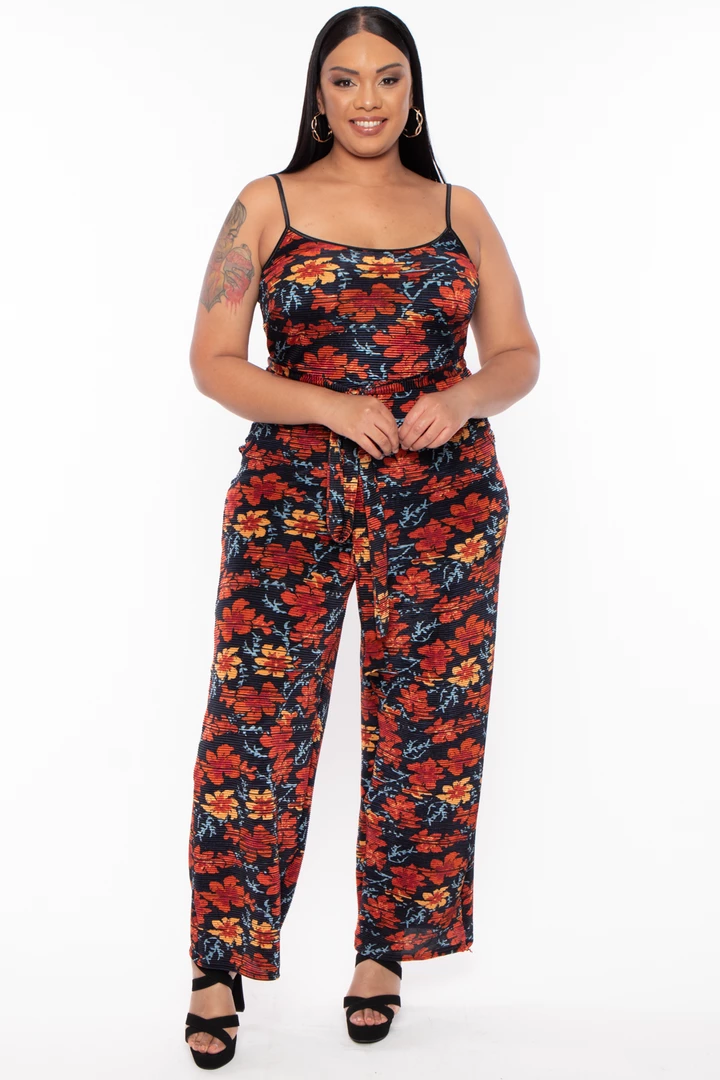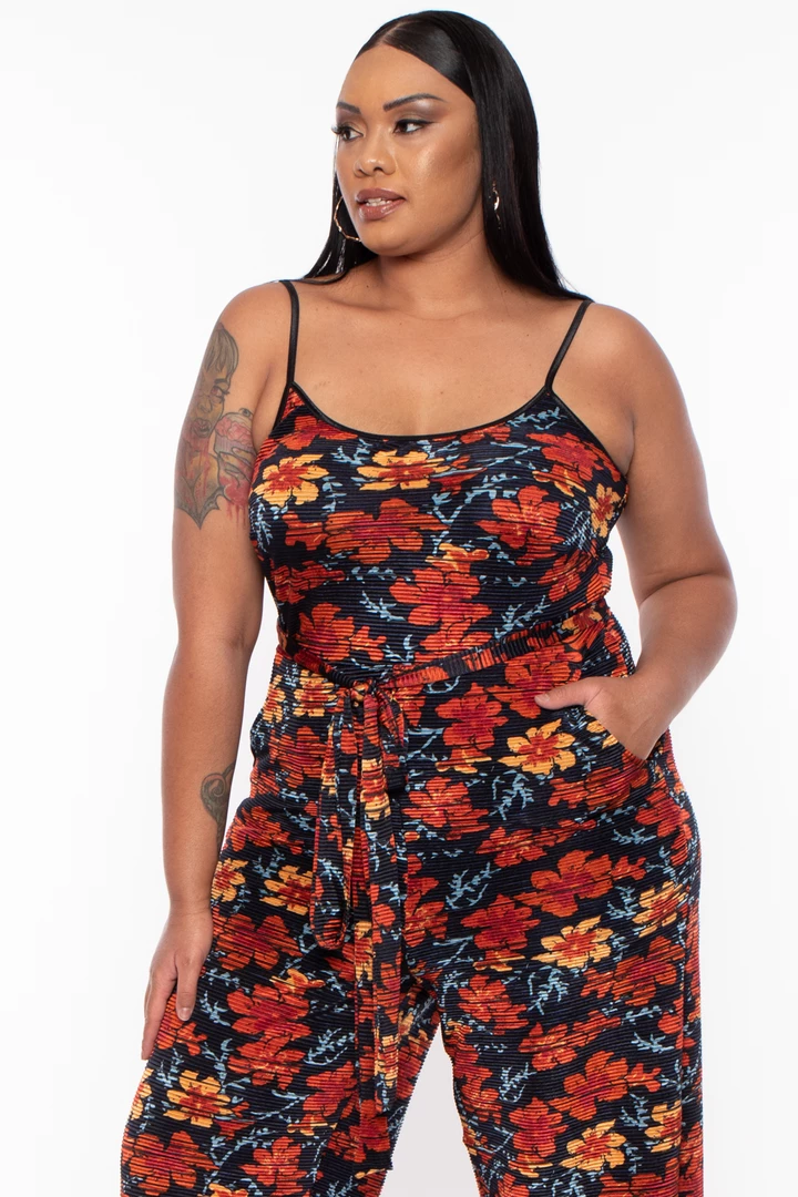 This plus size stretch jumpsuit features an all over floral print, a round neckline, adjustable cami straps, sleeveless, side pockets, a removable self tie belt. and semi flare long legs jumpsuit