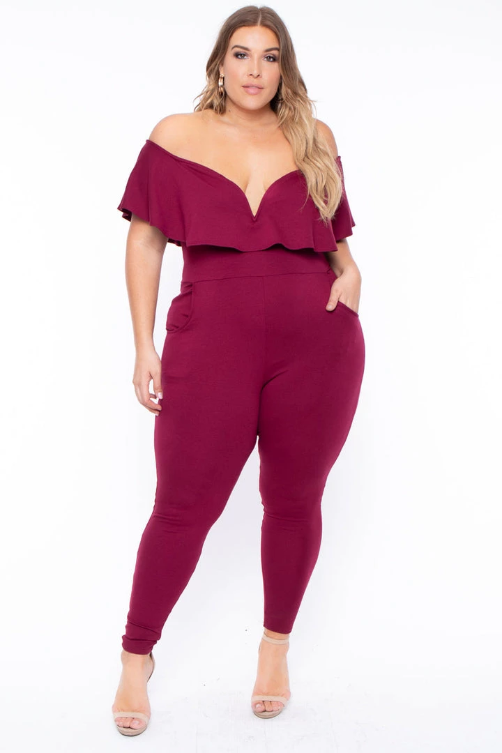 Curvy Sense Plus Size Frill Jumpsuit – Burgundy Back In Stock