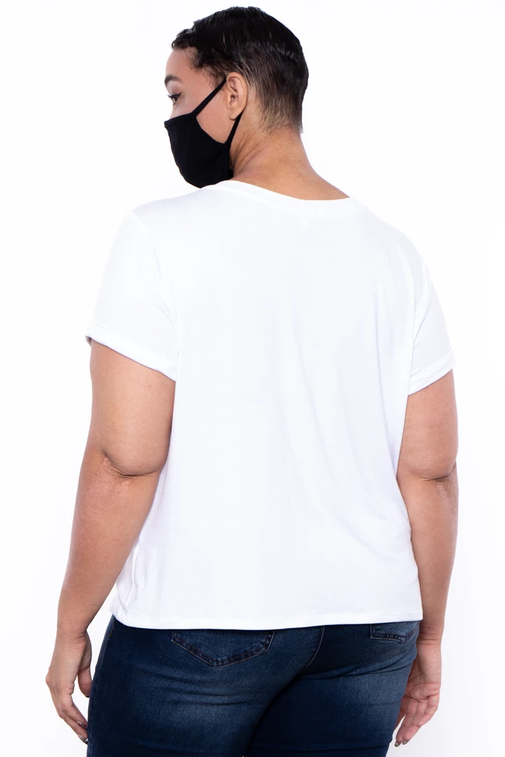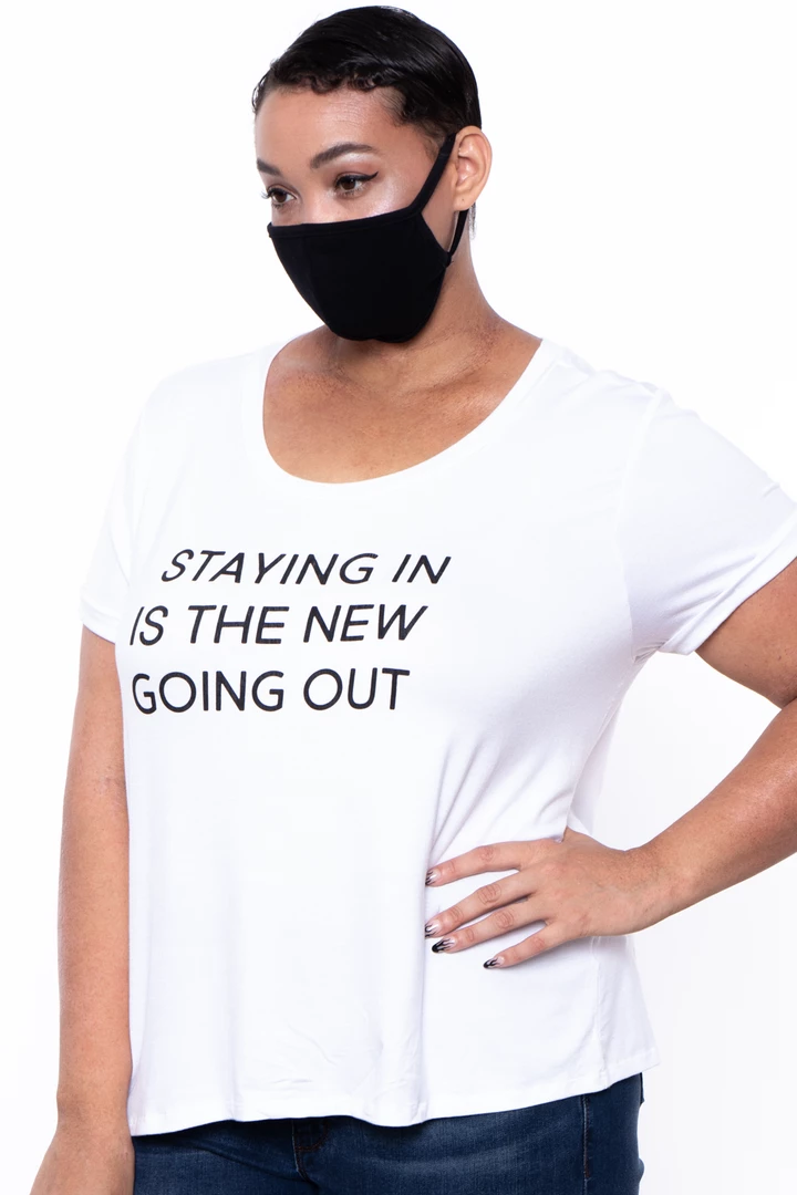 This plus size, stretch knit tee & mask set features a scoop neckline, short sleeves, and a center graphic.