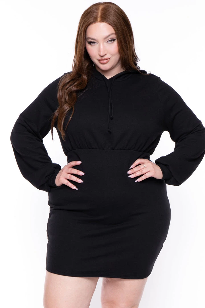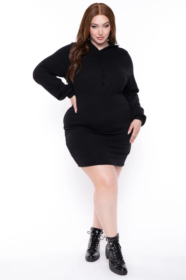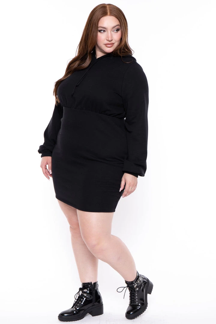 This plus size, hoodie sweatshirt dress features a cozy french terry material and adjustable drawstring hoodie. Great basic to dress up or down!