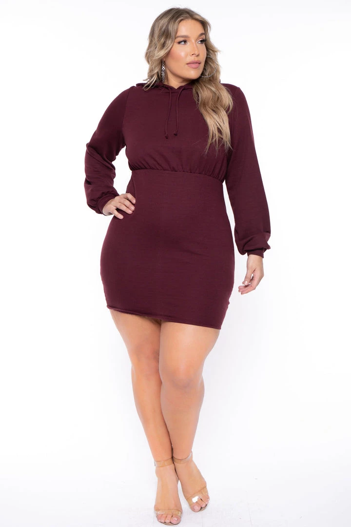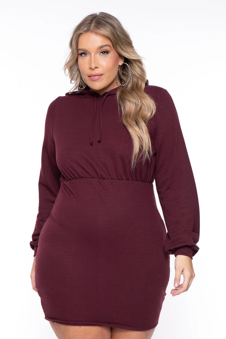 This plus size, hoodie sweatshirt dress features a cozy french terry material and adjustable drawstring hoodie. Great basic to dress up or down!