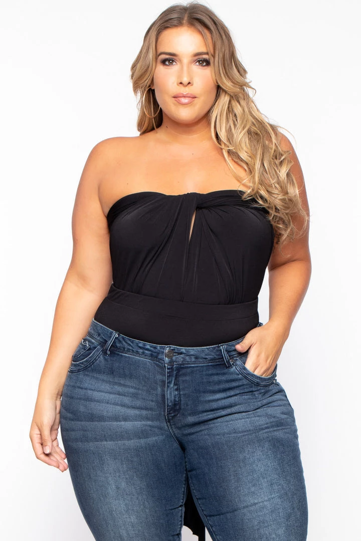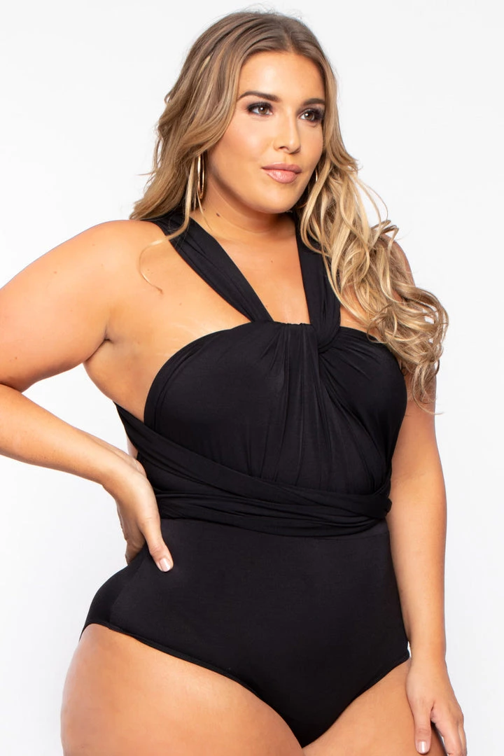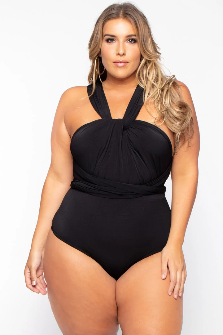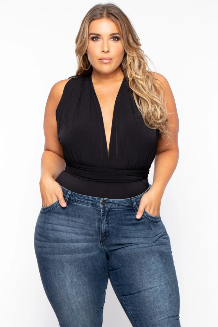 This plus size, extra stretch knit bodysuit features a sleeveless design, a halter self-tie wraparound criss cross neck with long drape, an open back, an elastic waistband, and a snap button at bottom hem.