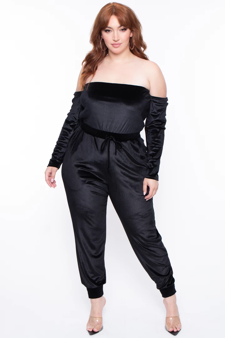 This plus size, stretch velour jumpsuit, features an elastic off the shoulder neckline, long sleeves, an elastic waistband with string detail relax leg, and self banded hem