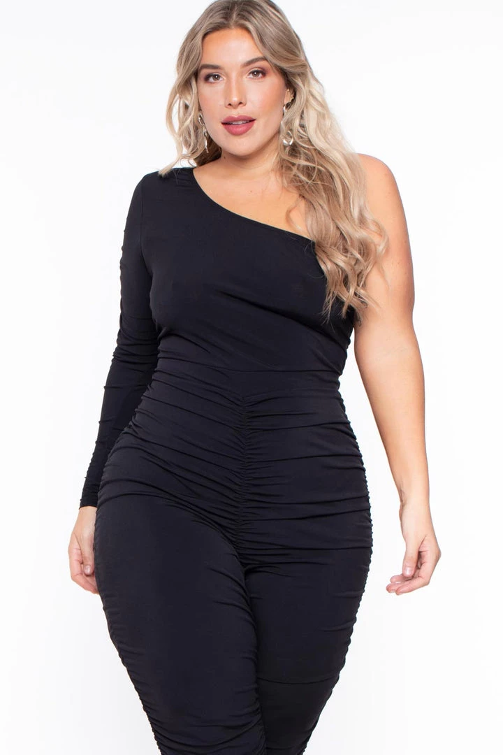 This plus size, jumpsuit is sexy and fun! Jaelyn features all over ruching to accentuate all your curves, asymmetric neckline and long sleeve