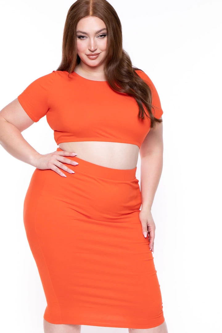 This plus size, crop top and skirt matching set features a curve hugging silhouette, short sleeve crop top and knee length matching skirt