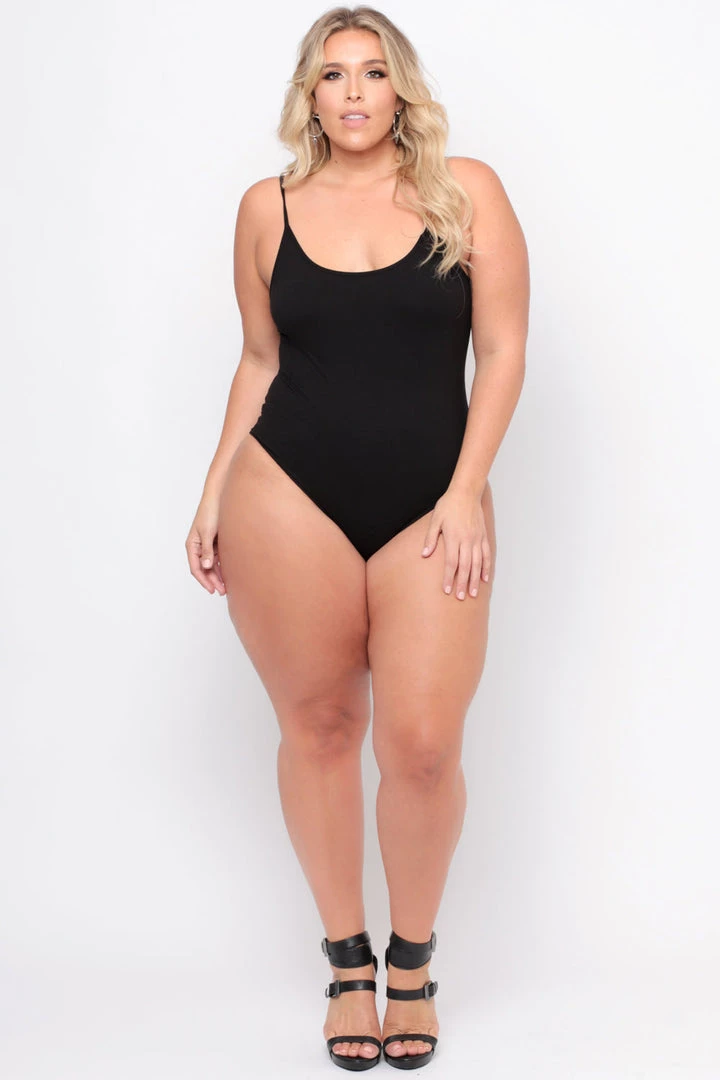 This plus size, extra stretch jersey knit bodysuit features a round neckline, adjustable spaghetti strap, snap bottom closure, a sleeveless cut, and contrast binding.