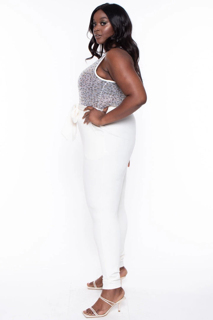 This plus size, sleeveless jumpsuit features a gold/silver sequin design with ivory pants and belted sash, keyhole back with dome button closure and pockets
