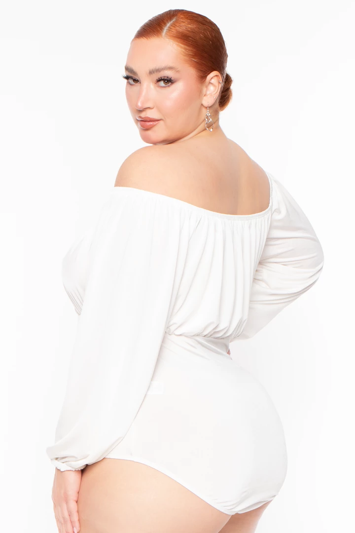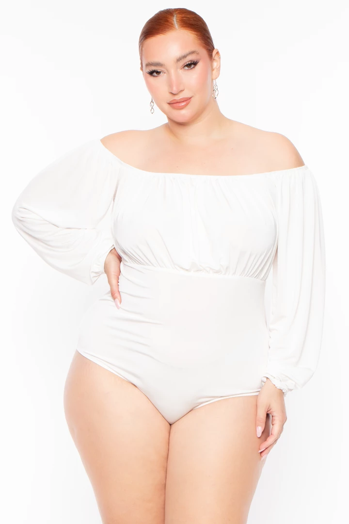 This plus size, stretch bodysuit features a sexy off the shoulder look, flowing peasant sleeves and snap closure