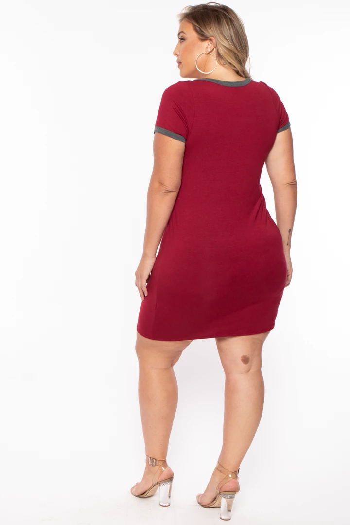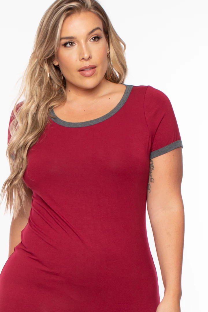 This plus size, stretch knit tee dress features a crew neckline, contrasting binding, short sleeves, drape, and a relaxed fit.