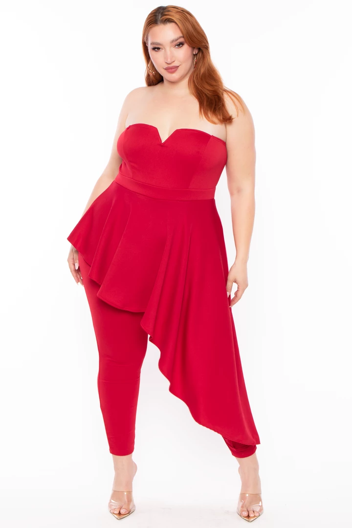 This plus size stretch knit jumpsuit features an elasticized sleeveless v-neckline with added v wire for support, banded waist, an asymmetrical cascading ruffle detail, and a skinny leg.