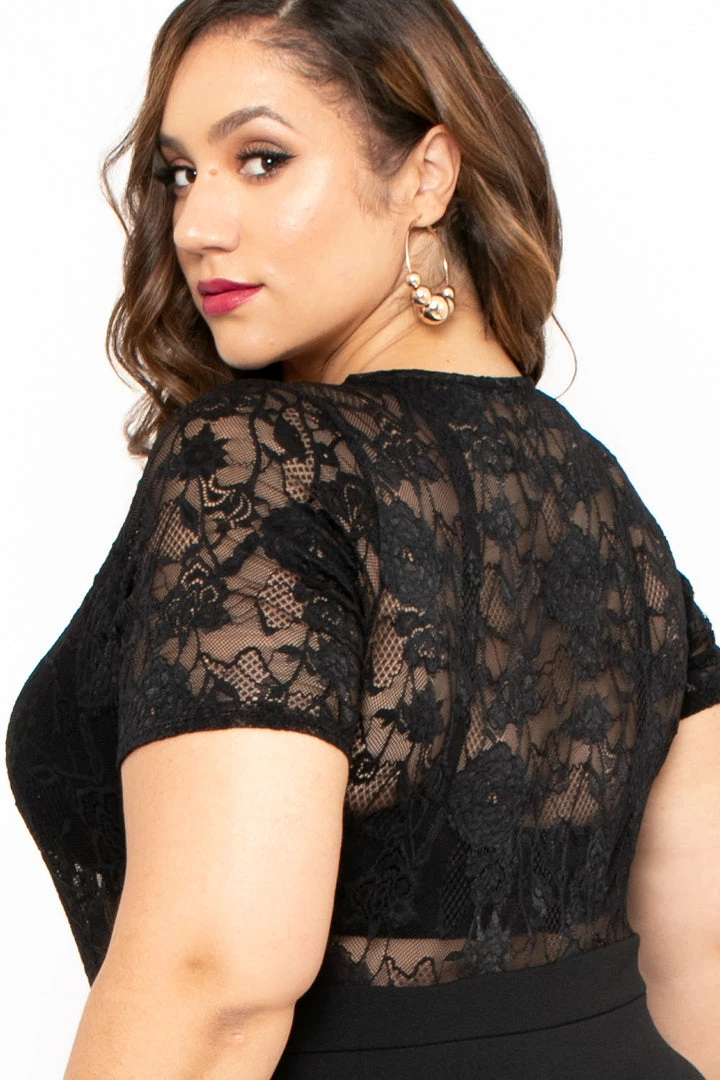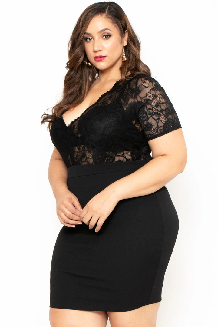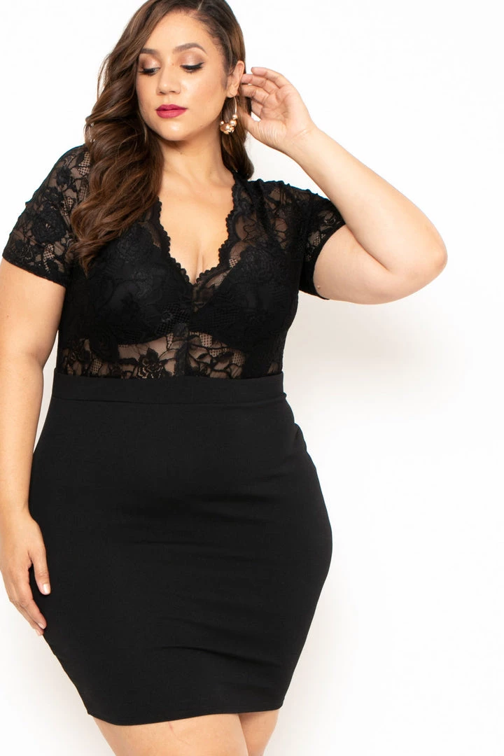 This plus size, stretch knit dress features a scallop lace bodice, plunging V neckline, short sleeves, banded waist, and a form fitting silhouette