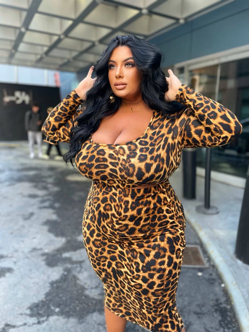 This plus size, stretch knit bodysuit features a round neckline, long sleeves, an allover leopard print, and a bodycon silhouette.