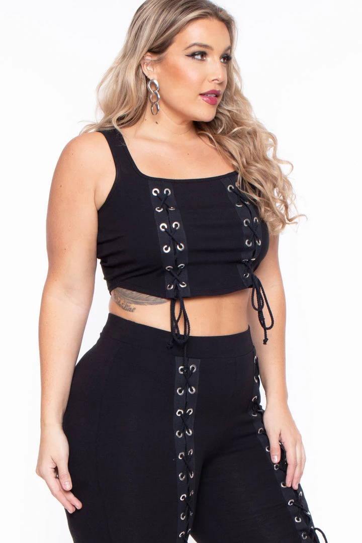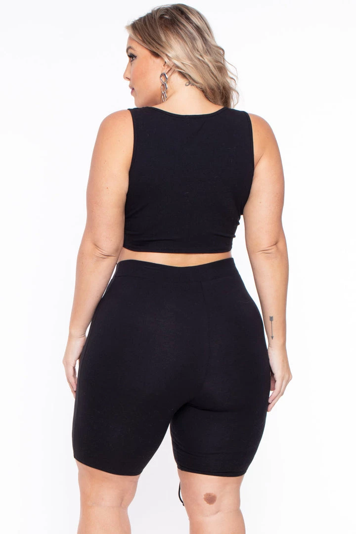 This plus size, matching set is sexy and cool for a night out! Lexie features a cropped tank and biker short matching set, lace up grommet detailing, strapless, and great stretch