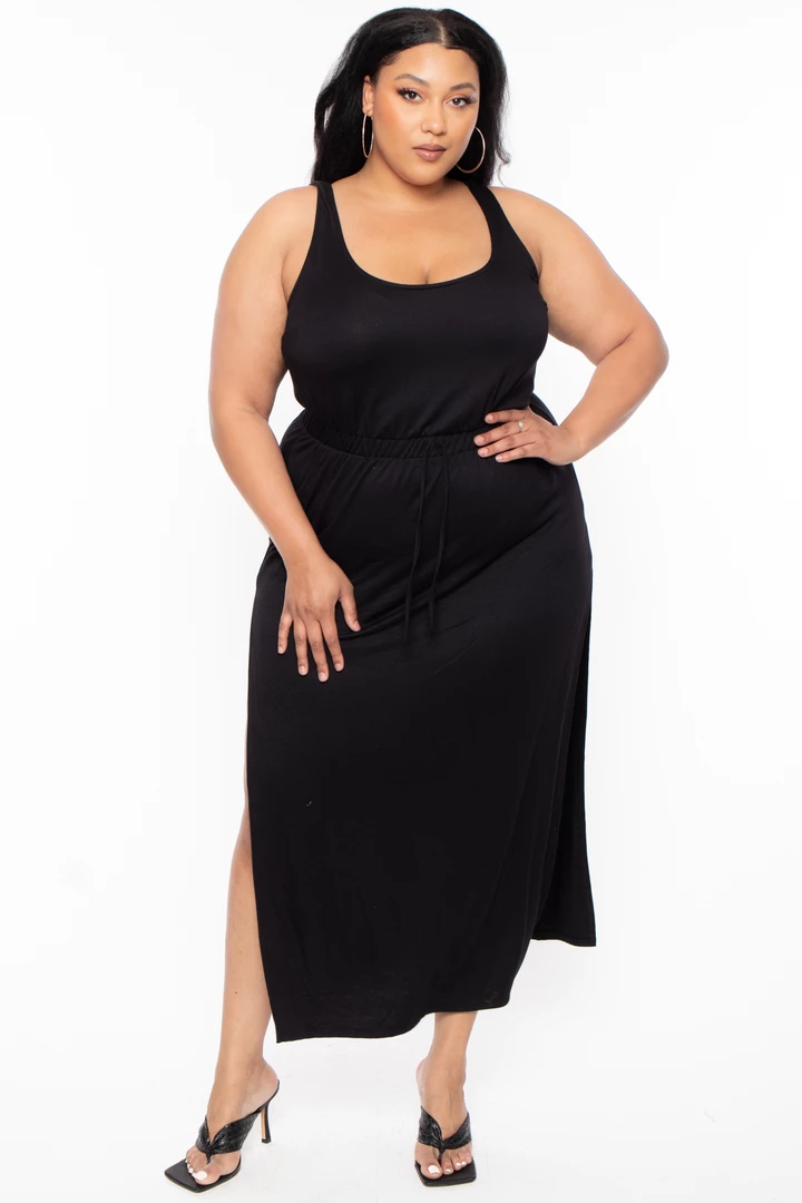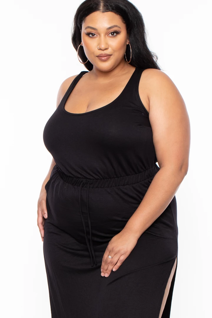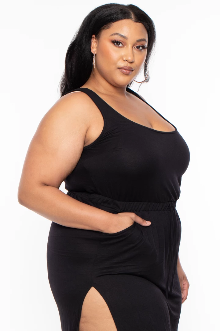 This plus-size, stretch knit maxi dress features a scoop neckline, a sleeveless cut, elastic at waist and front bow detail, side pockets side slits, and a maxi length