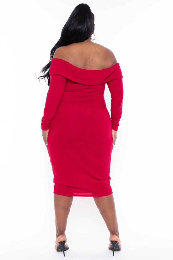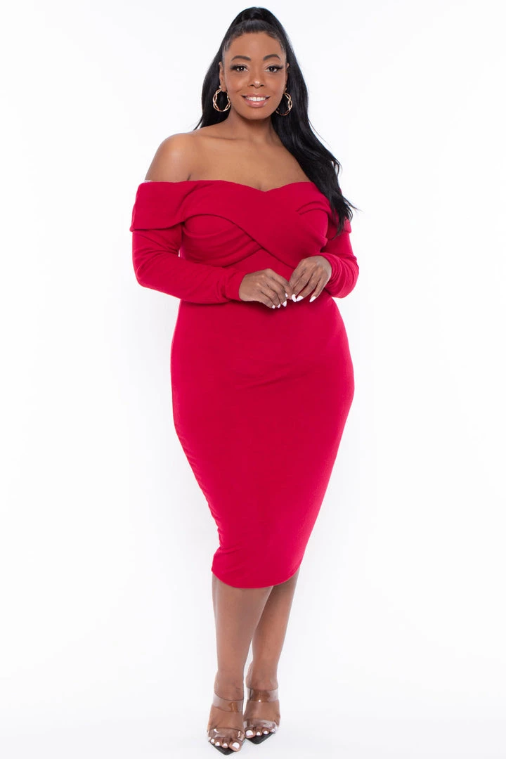 This plus size, off the shoulder dress features a sexy crossover design that drapes beautifully across your shoulders. This material is incredibly soft light brushed knit material with long sleeves.