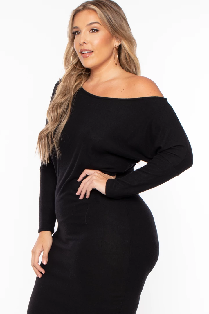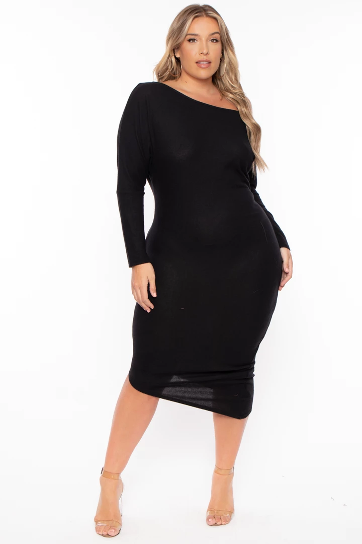 This plus size, stretch knit sweater dress features a round off one shoulder neckline, long sleeves, an asymmetric hem, and a bodycon silhouette.