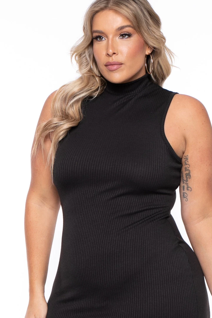This plus size, bodycon dress features lightweight ribbed material, sleeveless, high neckline basic that you can dress up or dress down!
