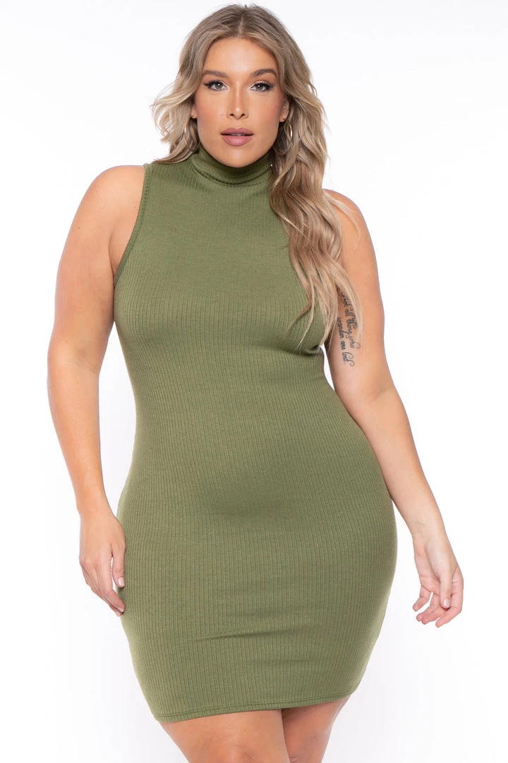 This plus size, bodycon dress features lightweight ribbed material, sleeveless, high neckline basic that you can dress up or dress down!