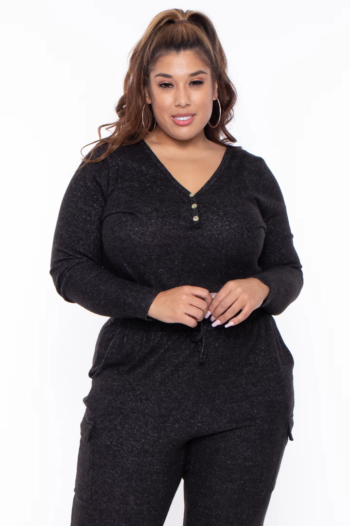 This plus size set futures a sweater knit with a V-neckline front button detail closure and crop hem with long sleeves. The pants have an elasticized waist with adjustable drawcord side pockets and cargo pockets, with self banded hem, a very comfy set